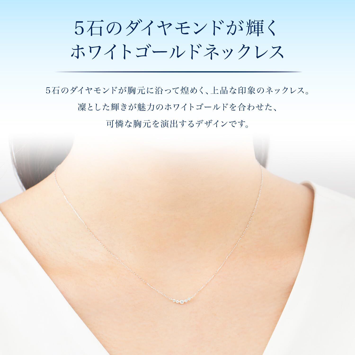 5石のダイヤモンドが胸元に沿って煌めく上品な印象のネックレス。凜とした輝きが魅力のホワイトゴールドを合わせた、女性らしい可憐な胸元を演出するデザインです。