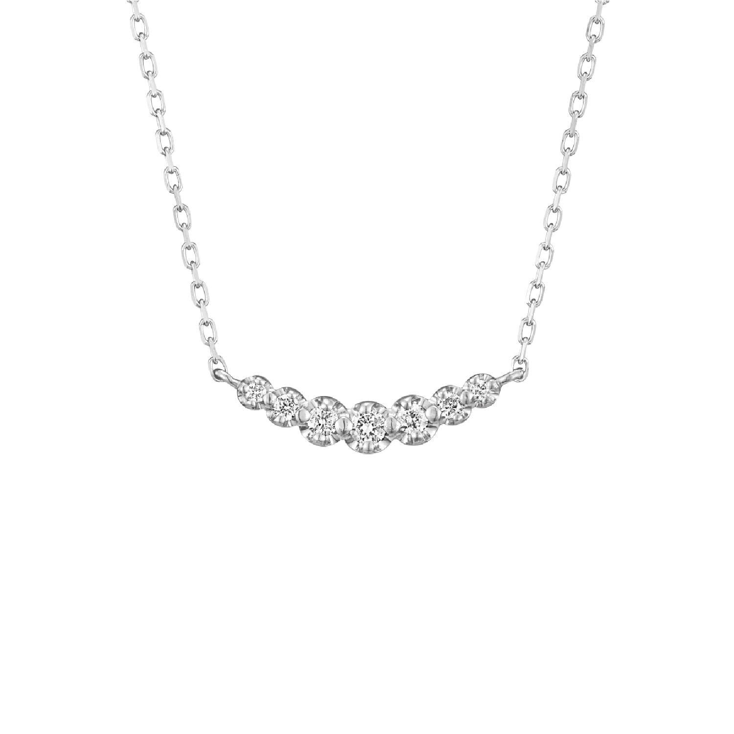 7石のダイヤモンドが煌めく華やかな印象のネックレス。デコルテを美しくみせる優しいラインに輝くダイヤモンドと、ホワイトゴールドの凜とした色合いが魅力的なデザイン。上質な輝きが女性らしいエレガントな胸元を演出します。