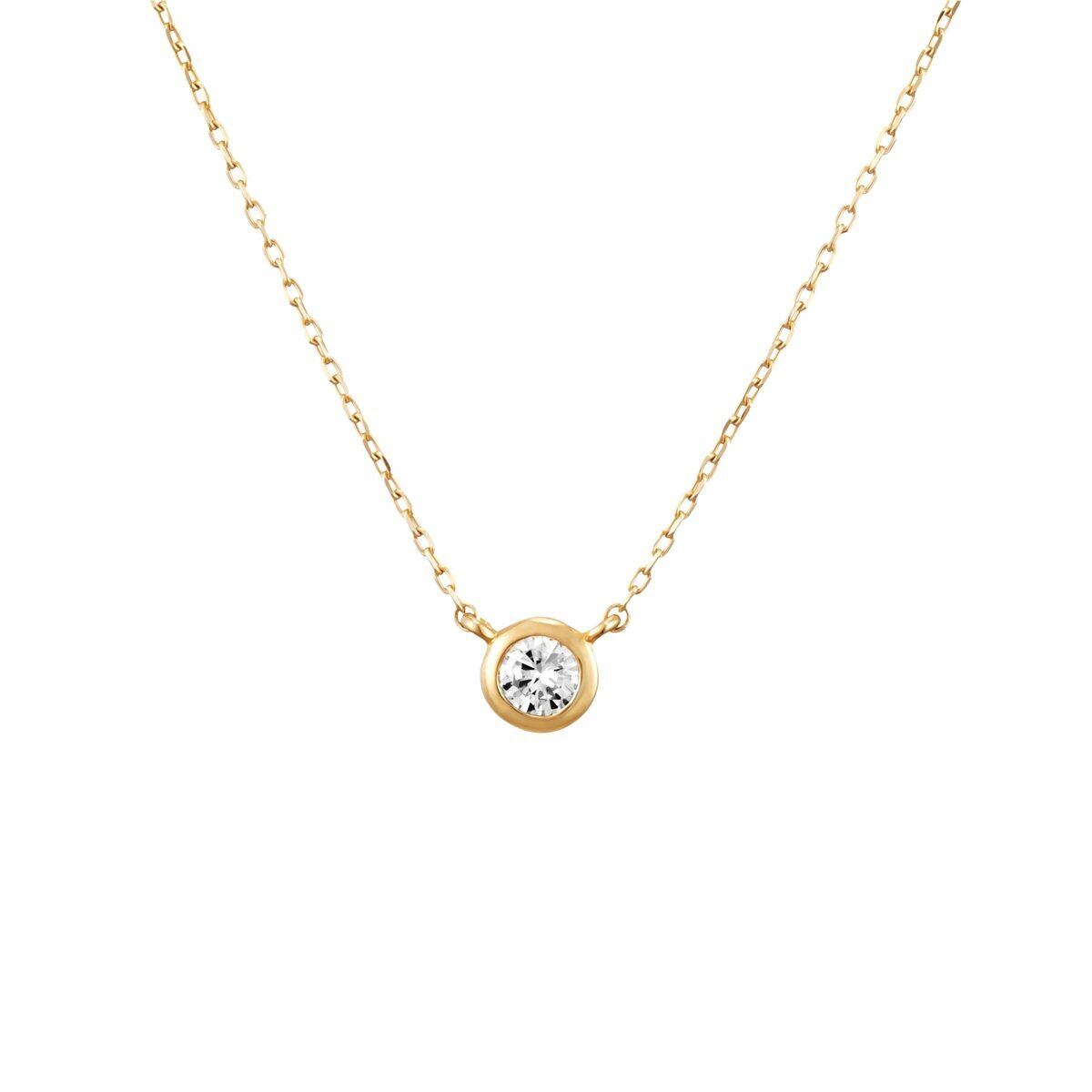 上品な胸元を演出する、シンプルな一粒ダイヤモンドのネックレス。イエローゴールドの華やかな彩りでダイヤモンドの周りを繊細に包んでいます。スタイルを選ばずに身に着けられる、洗練されたデザインです。