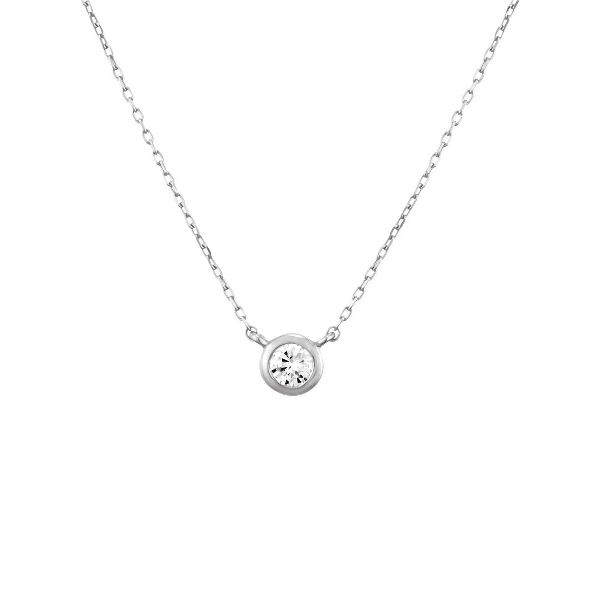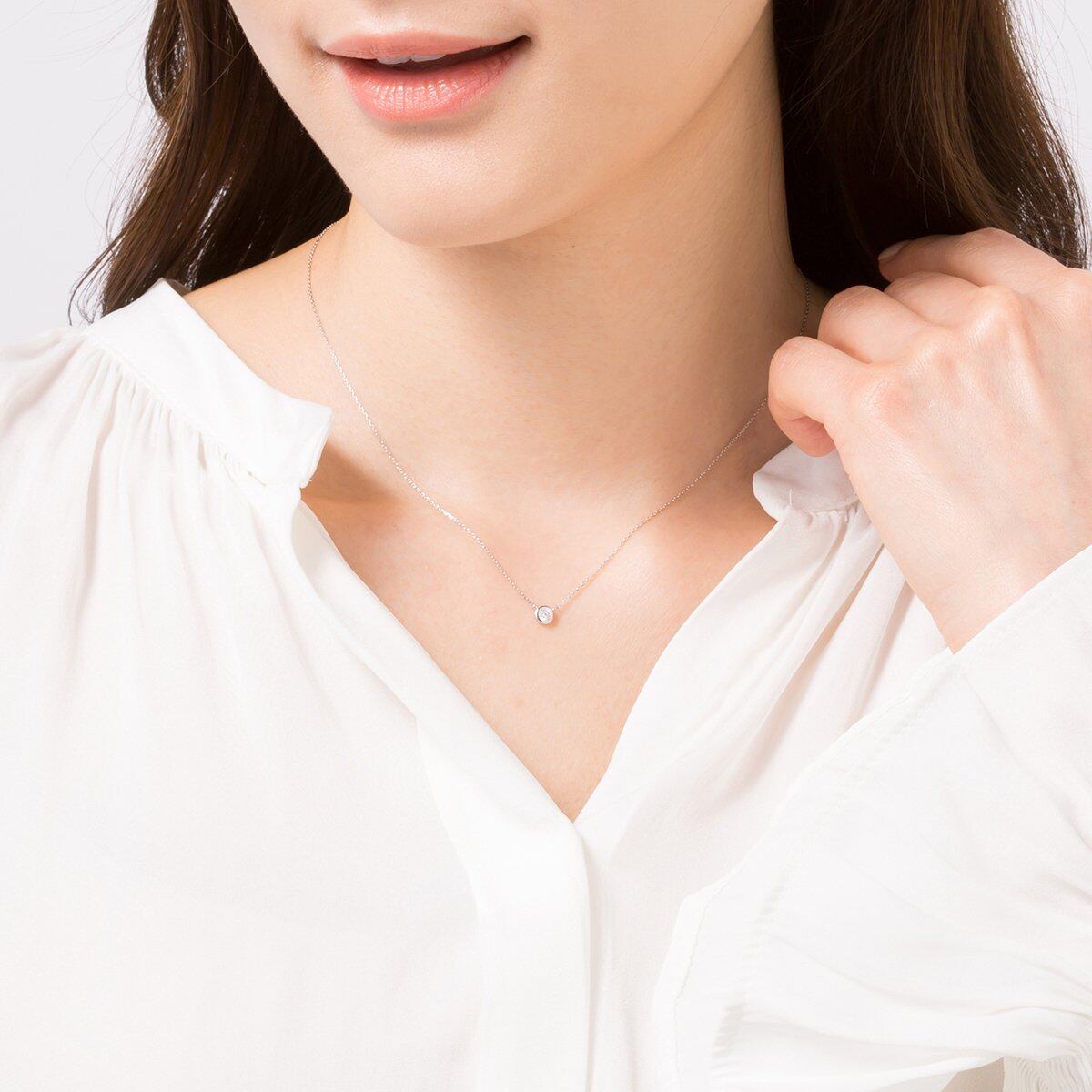 上品な胸元を演出する、シンプルな一粒ダイヤモンドのネックレス。ホワイトゴールドの凜とした彩りでダイヤモンドの周りを繊細に包んでいます。スタイルを選ばずに身に着けられる、洗練されたデザインです。