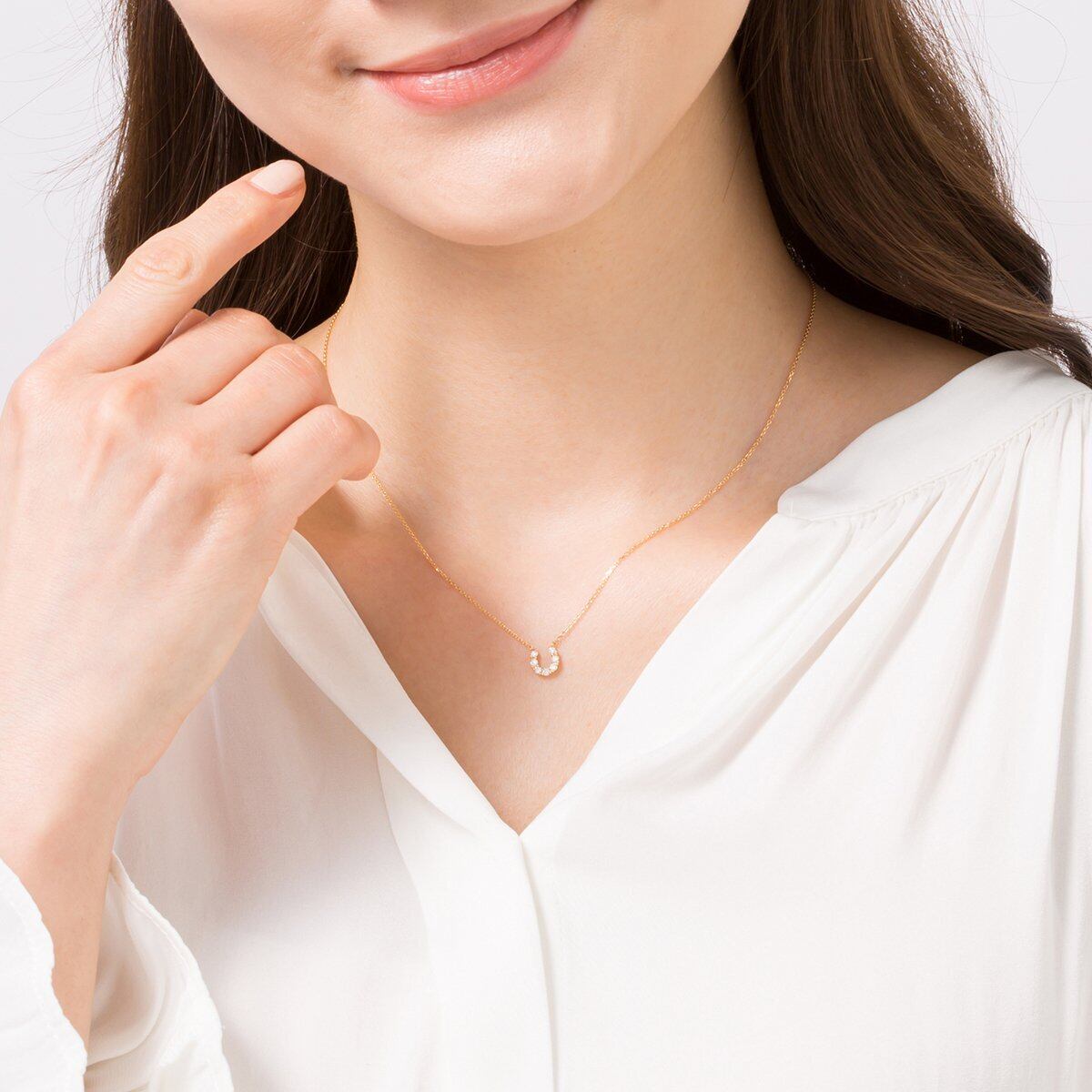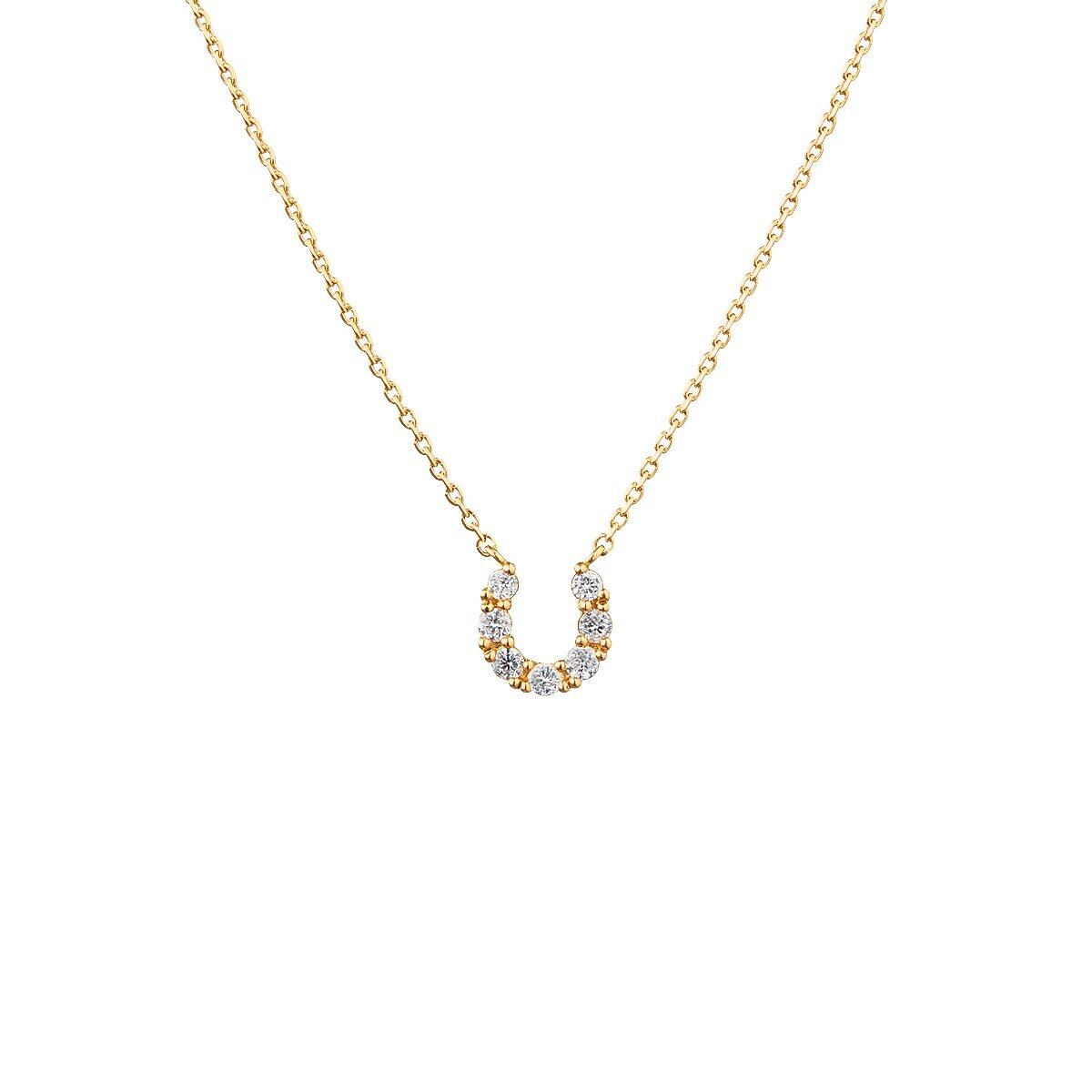 幸運を呼びこむといわれる馬蹄モチーフのネックレス。ダイヤモンドが華やかにきらめき、胸元を美しく彩ります。イエローゴールドの眩い輝きも魅力的な、エレガントなデザインです。