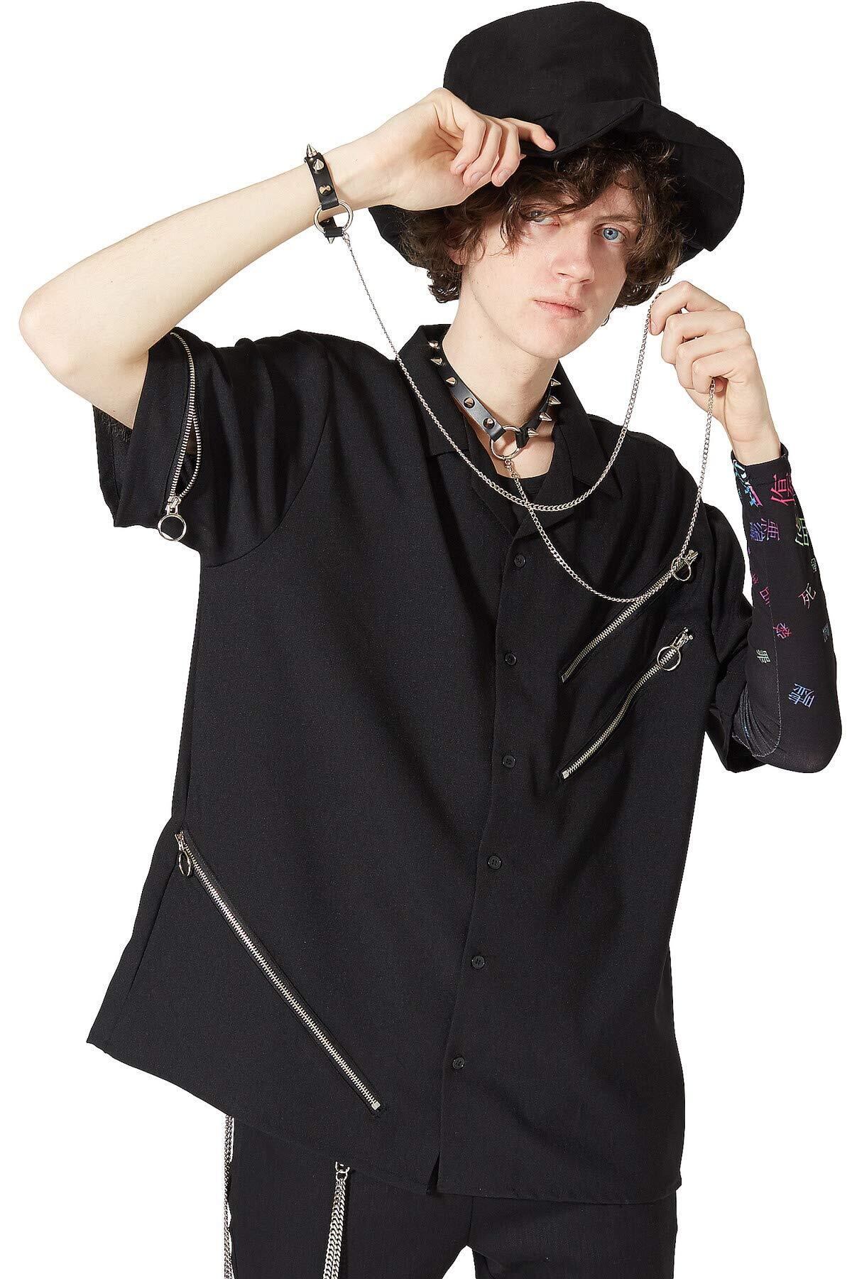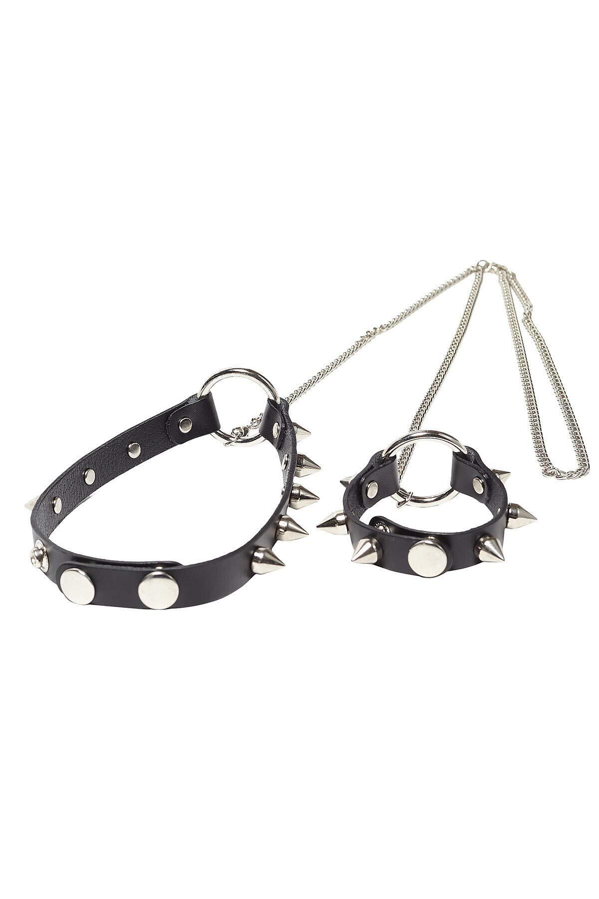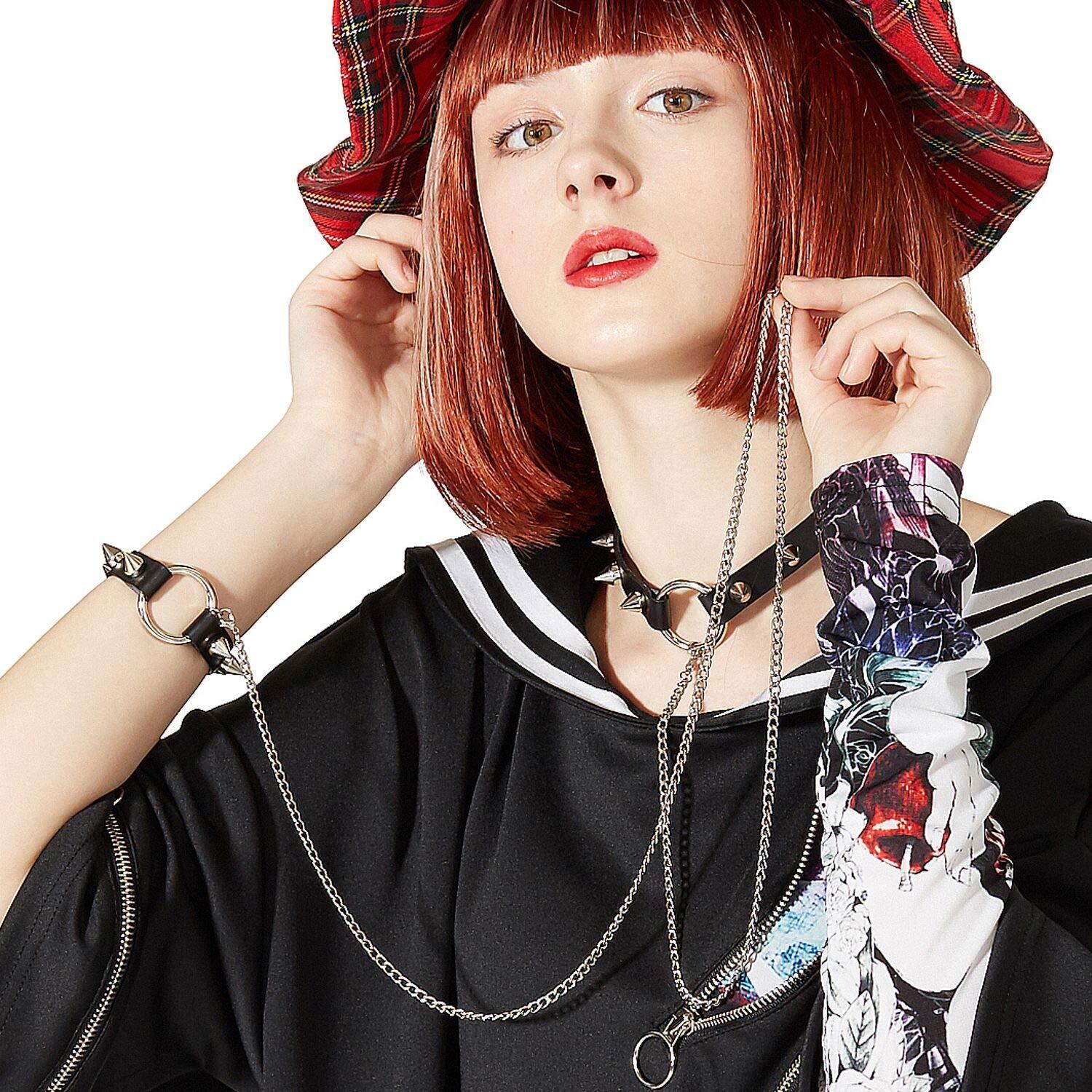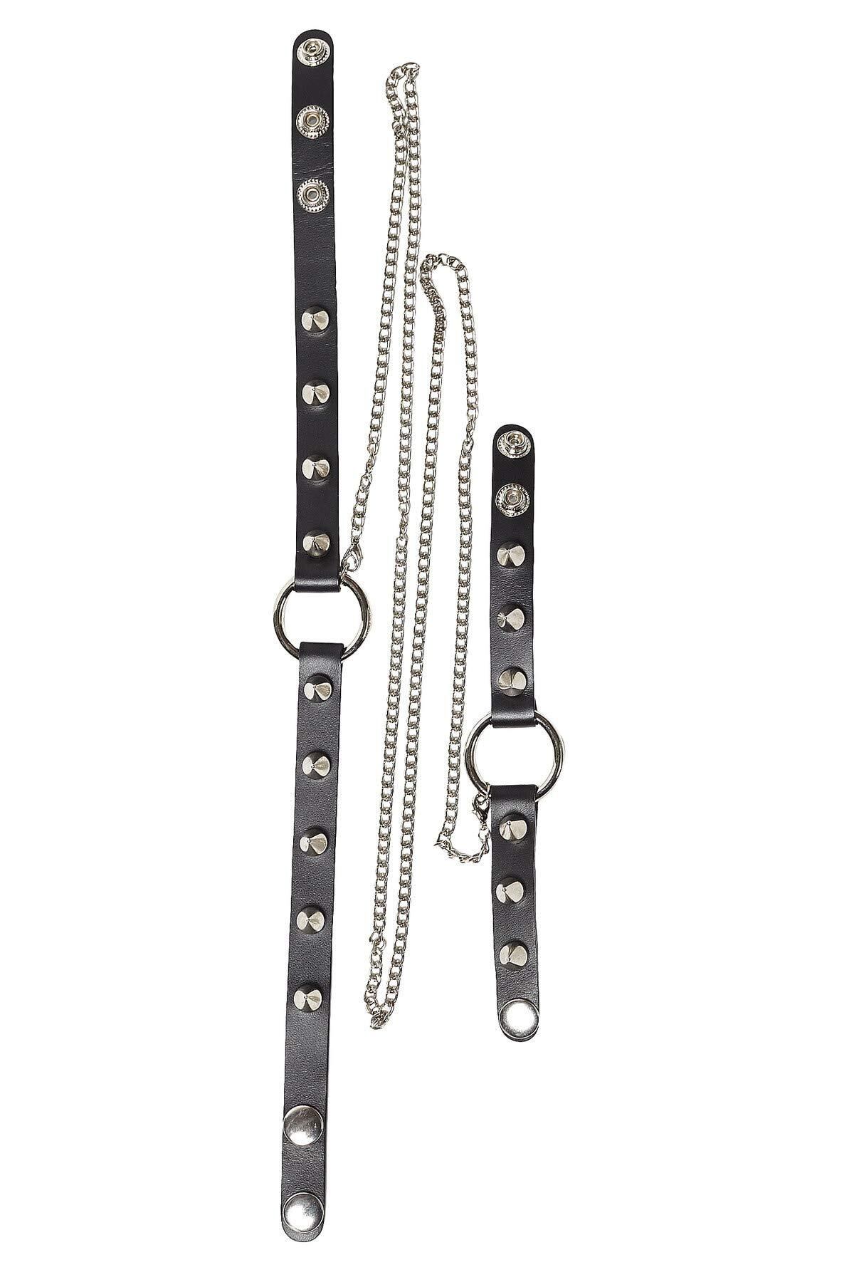 首元のリングからシルバーロングチェーンでシンプルなリングブレスレットを繋いだセルフ奴隷デザイン×ハードなパンキッシュニュアンスを与えるスタッズデザインがハイパーインパクト。