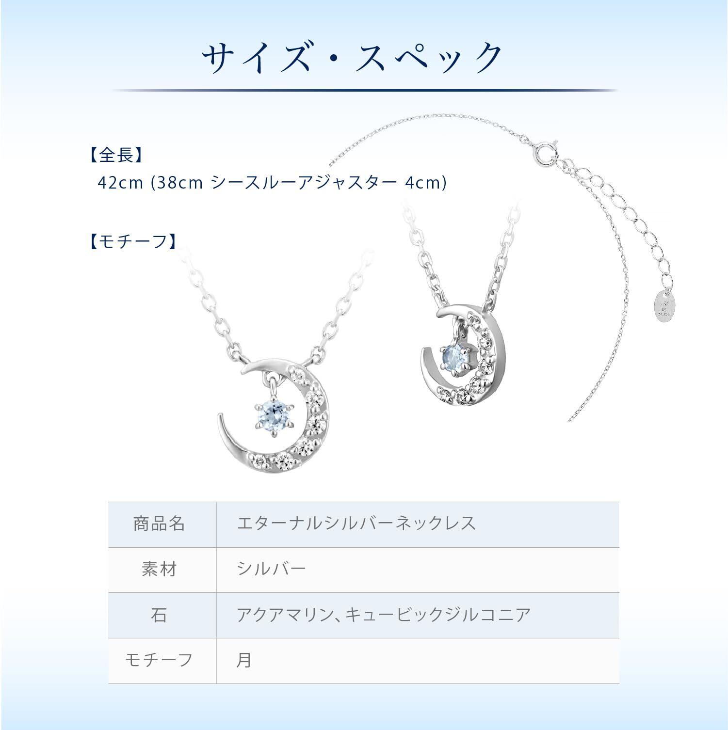 変色しにくい「エターナルシルバー」を使用した、月モチーフのネックレス。女性の魅力を引き出すといわれる月モチーフには、キュービックジルコニアが華やかにきらめきます。揺れるアクアマリンのみずみずしい輝きがアクセントになった、可憐なデザインです。※天然石を使用しているため、実際の色味や風合いが異なる場合がございます。