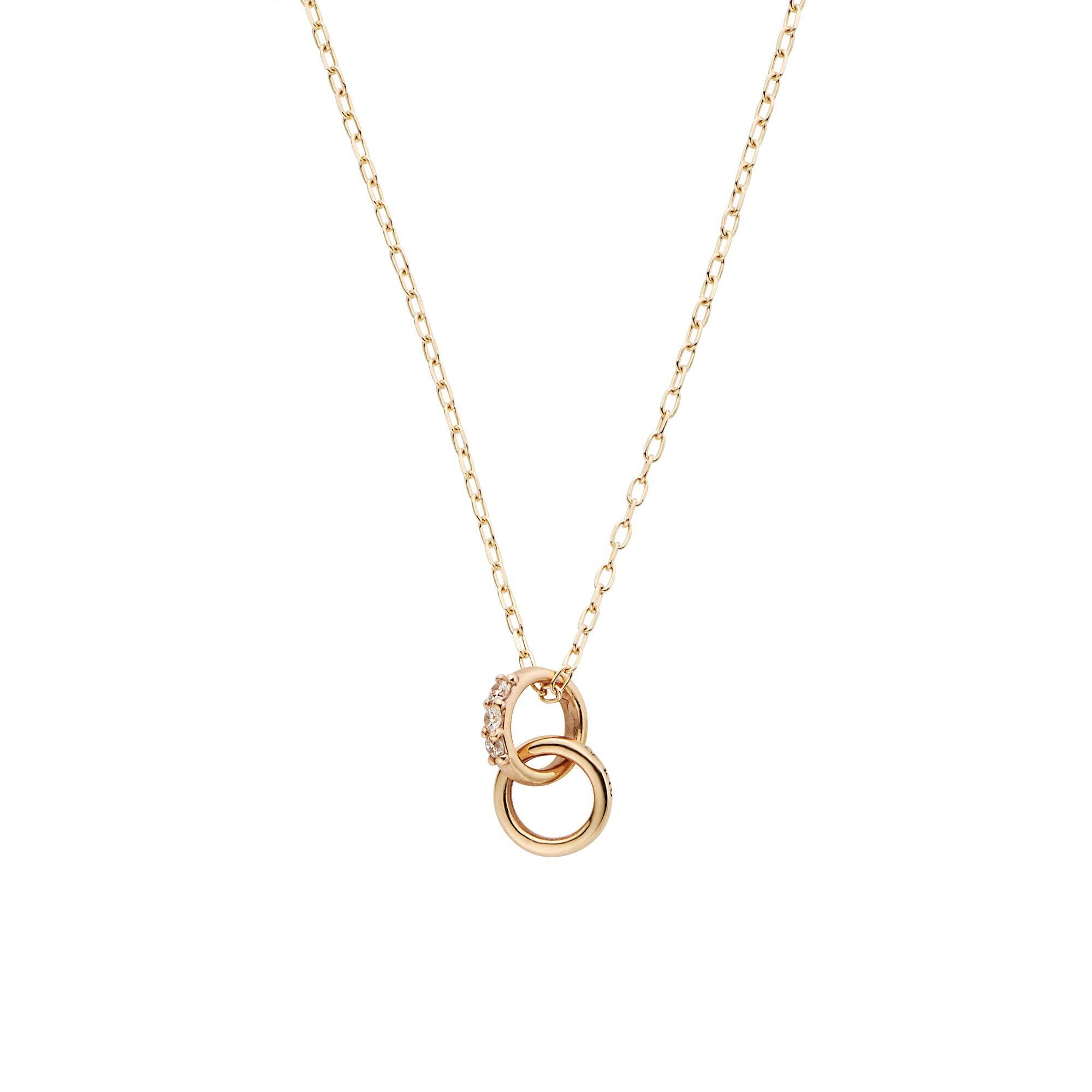 シンプルな2つのサークルを繋げたデザイン。チェーンの通し方を変えれば、縦に連なるデザイン、2つの輪がリンクするデザイン2WAYでお使いいただけます。サークルの一つにはきらりと輝くダイヤモンドが。地金の表面に荒らしの加工を施し、マットのような素材感を出すことで、お洒落な雰囲気に。