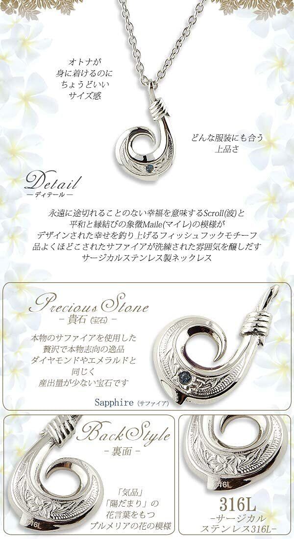 【数量限定】[Aloha lokahi] ハワイアンジュエリー ネックレス ペンダント アクセサリー サージカルステンレス ハート 天然サファイア フィッシュフック 釣り針 プルメリア スクロール ステンレスシルバー あずきチェーン | BOSSO