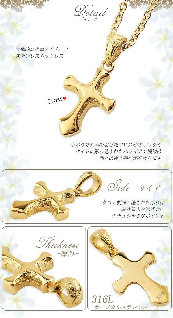 [Aloha lokahi] ハワイアンジュエリー ネックレス サージカルステンレス シンプル ステンレス クロス 十字架 立体 スクロール イエローゴールド あずきチェーン アクセサリー