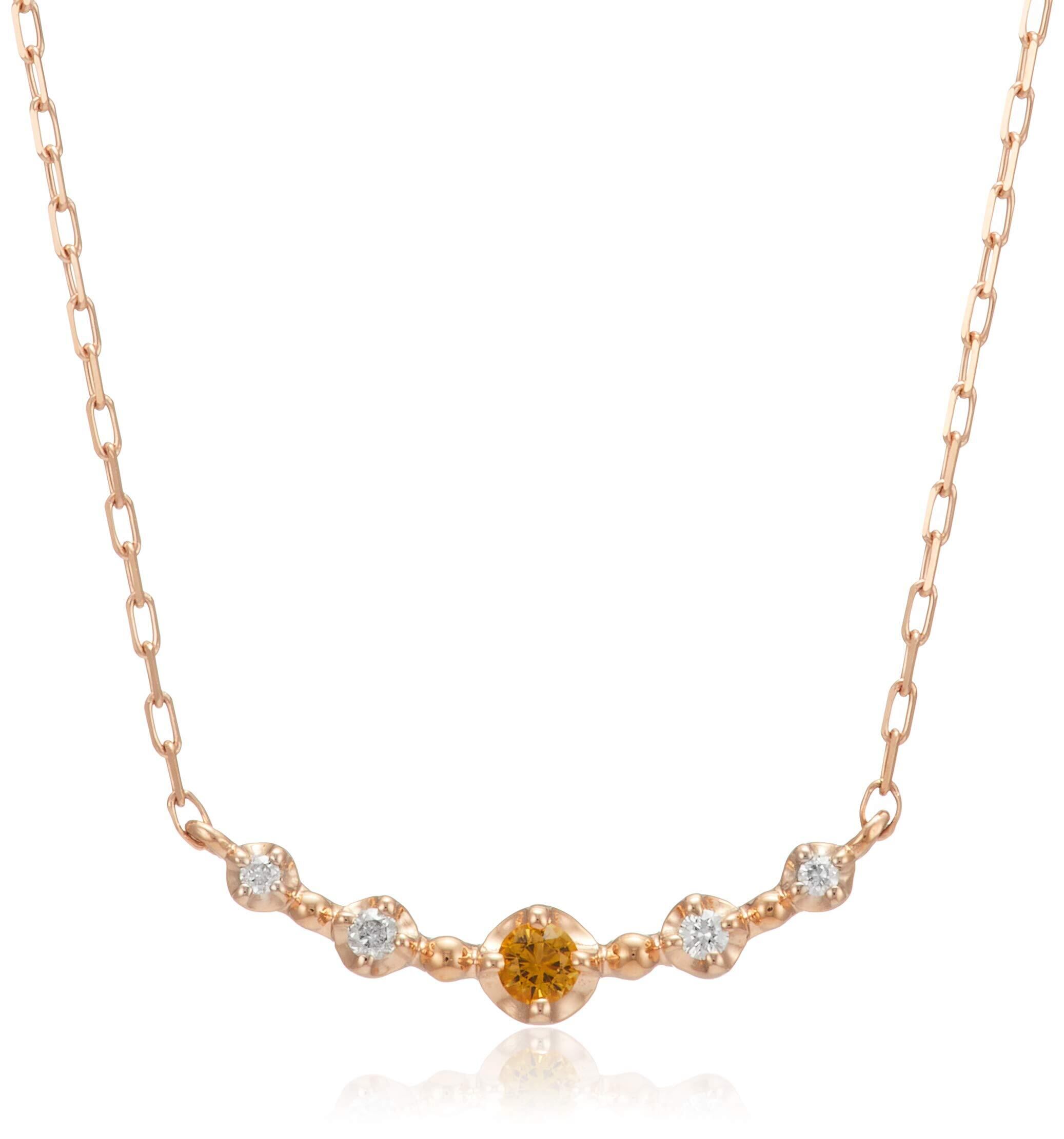 シトリンとダイヤモンドが胸元に沿ってきらめく、エレガントな印象のネックレス。11月の誕生石であるシトリンは希望や勇気をもたらすといわれ、美しい彩りが魅力です。ピンクゴールドの柔らかな輝きが、より女性らしさを引き立てます。プレゼントにもおすすめの、上品なデザインです。