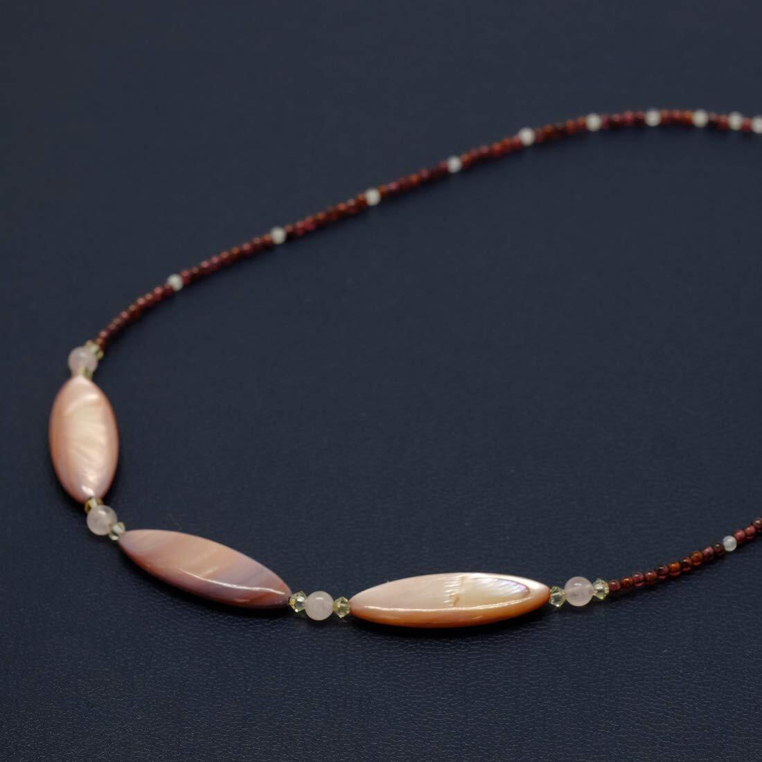 落ち着いたピンクカラー、特有の照りが美しいマーキスシェイプのシェルと天然石やスワロフスキーを組み合わせたネックレスです。