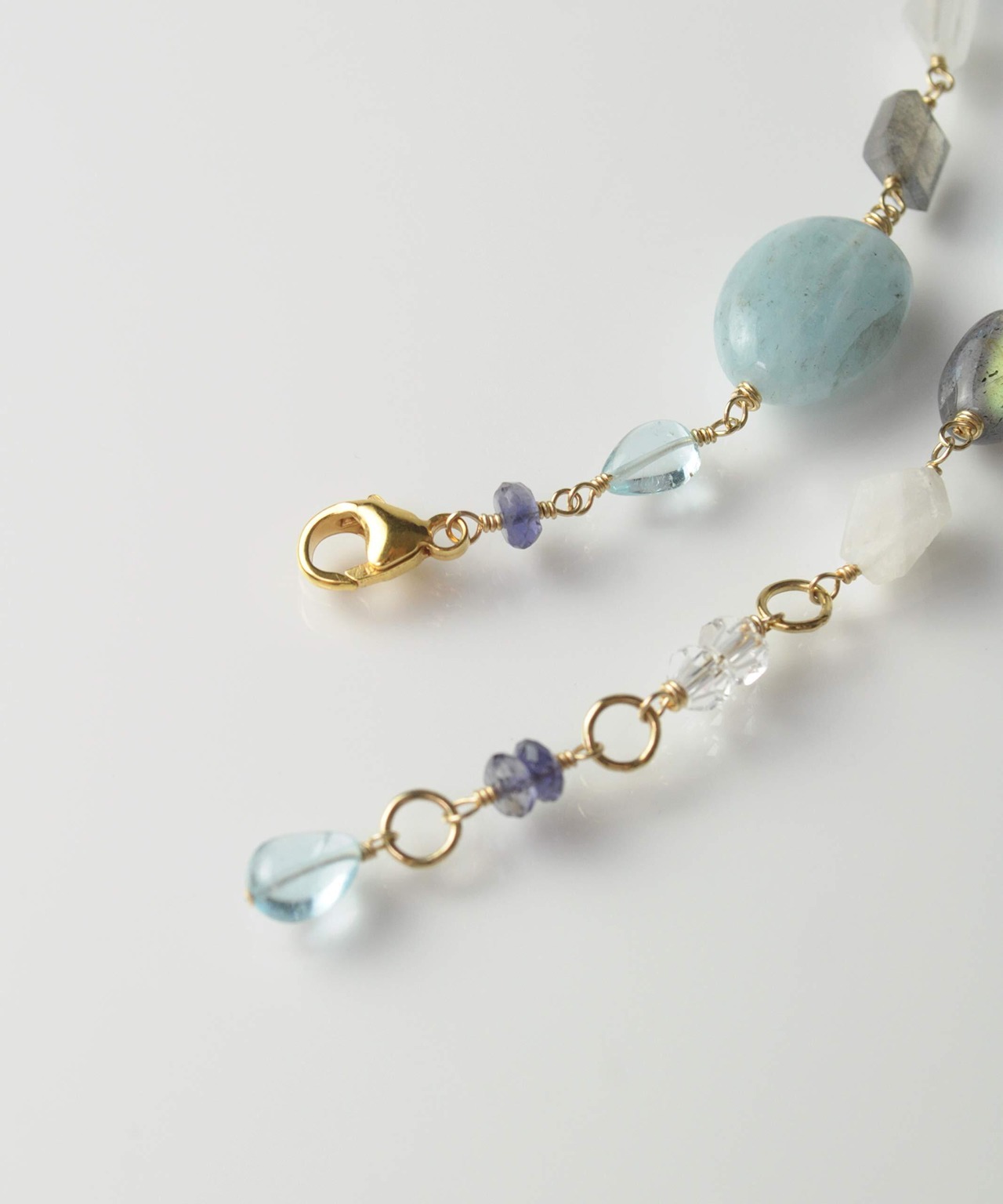 ネックレスはラブラドライトを合わせてニュアンスあるブルーの色合いに。