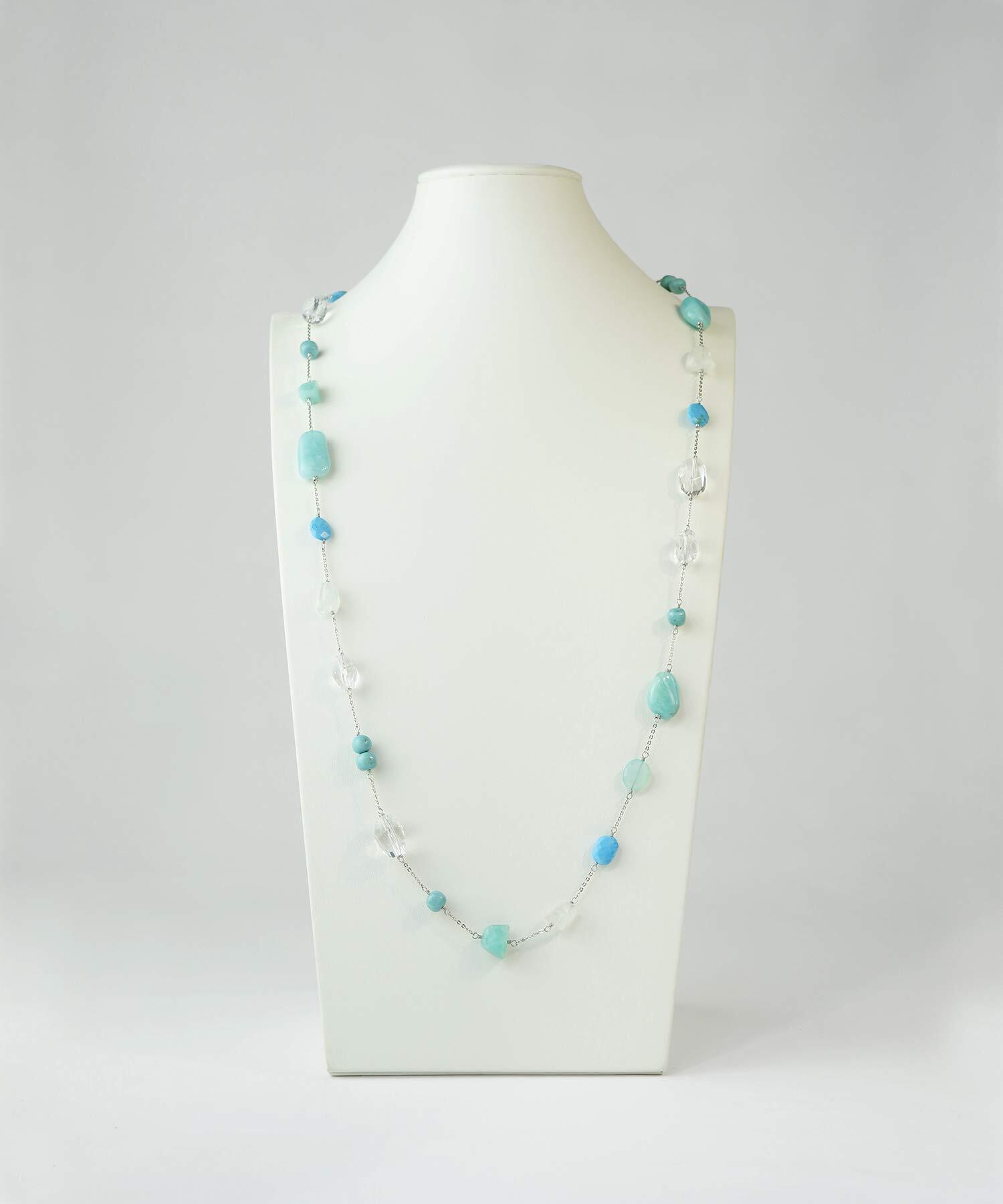 広がるスカイブルーの空のように、ターコイズとアマゾナイトが爽やかなロングネックレス。