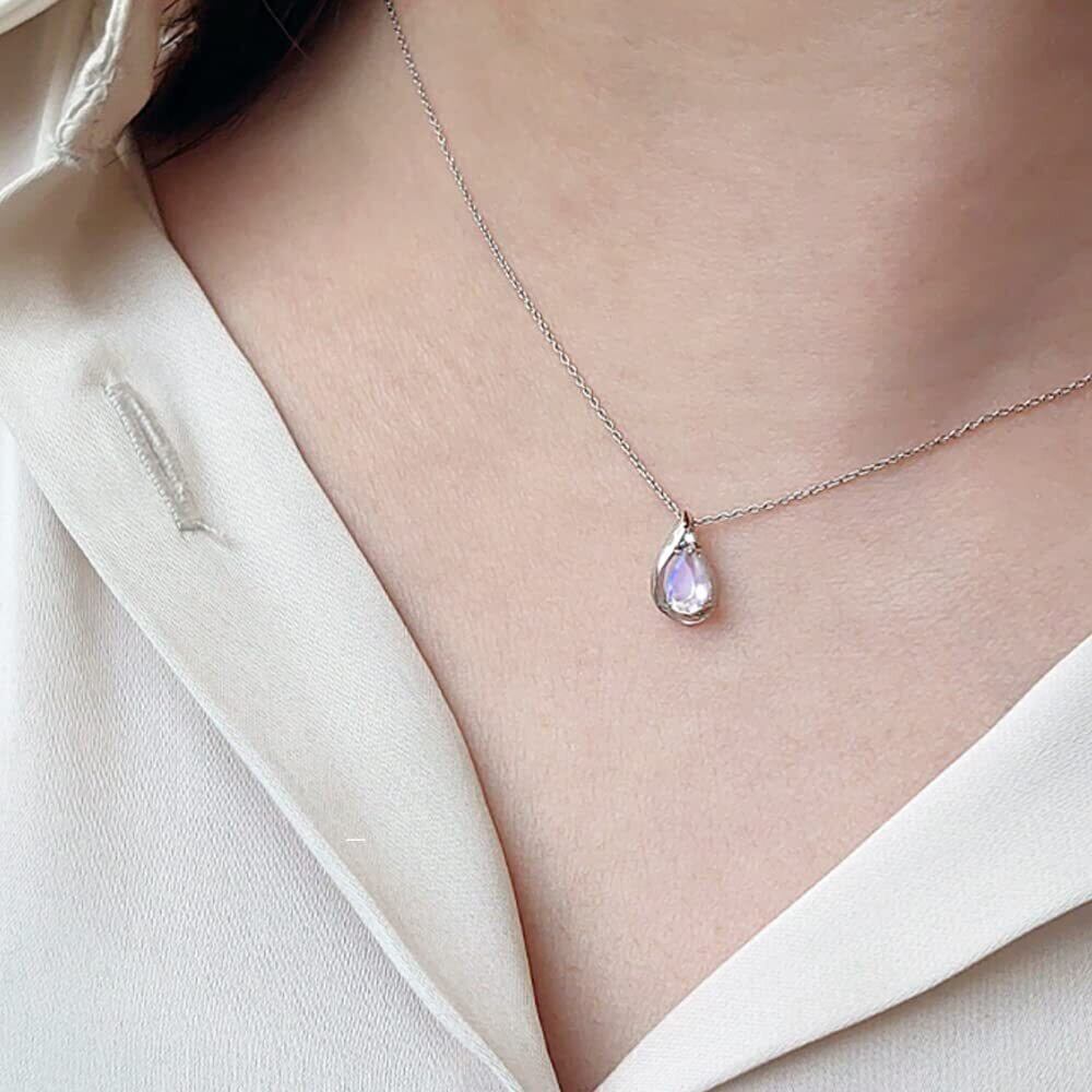 静謐な月の光を思わせるムーンストーンと対比に輝く小さなダイヤモンドがアクセントとなり、神秘的かつ清楚な印象を与えるネックレスです。