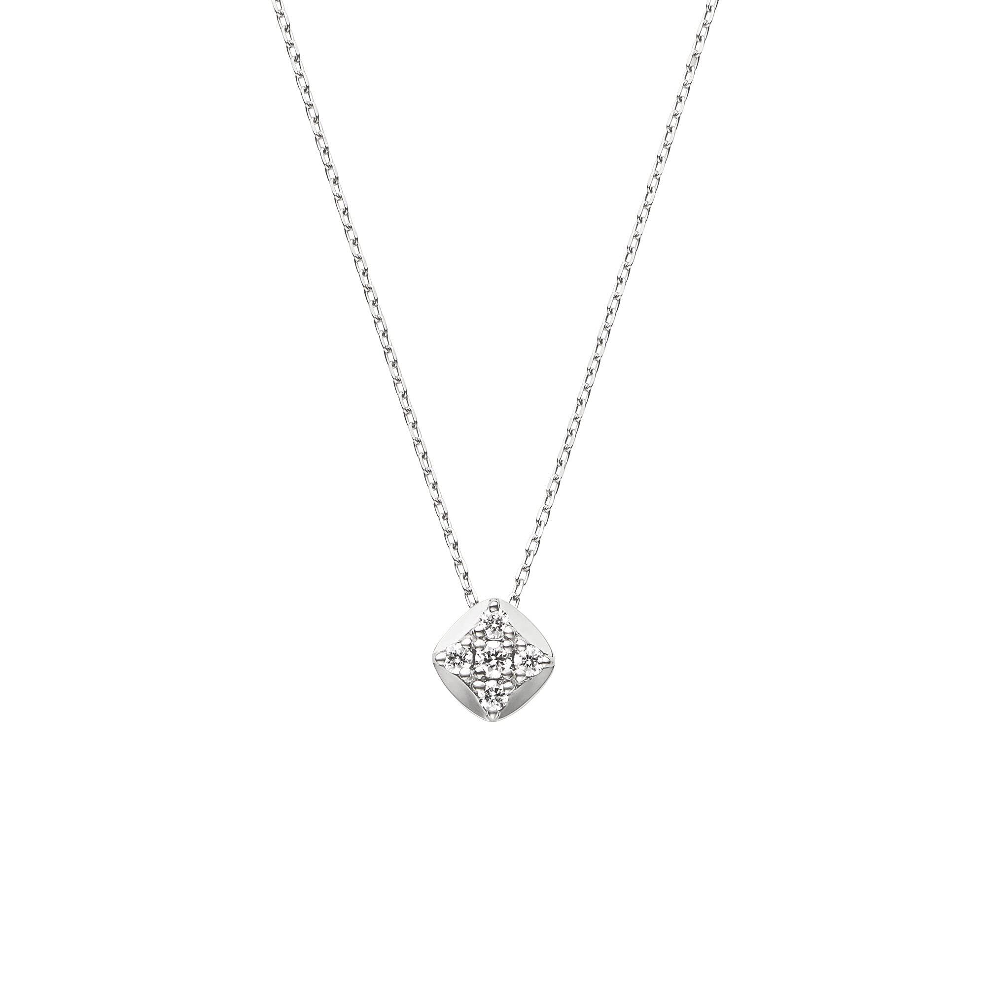 ・凛とした白い輝きが美しいプラチナネックレス。 ・角に丸みをつけたスクエアフォルムは、縁に効かせた地金のアールが効いてすっきりとした印象に。 ・ダイヤモンドは5石をぎゅっと中心に寄せ集め、相乗効果で互いに輝きを放ちます。 ・ベーシックスタイルの中に少しエッジを効かせたデザインが魅力。 ・華やかさのあるジュエリーは様々なシーンで装いをワンランクアップさせてくれそう。