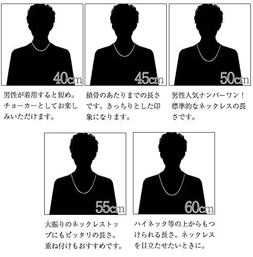 チェーンの輪をよじらせて平たくしたすべての輪を、正面を向けて連結しています。なめらかな輝きが特徴です。また、長さ45cmのチェーンはネックレスの定番の長さです。女性のデコルテを美しく見せてくれる長さで、カジュアルなコーデにも、ビジネスコーデにも、幅広く合わせられます。どの長さにすればよいか迷ったら、45cmを選べば間違いありません。