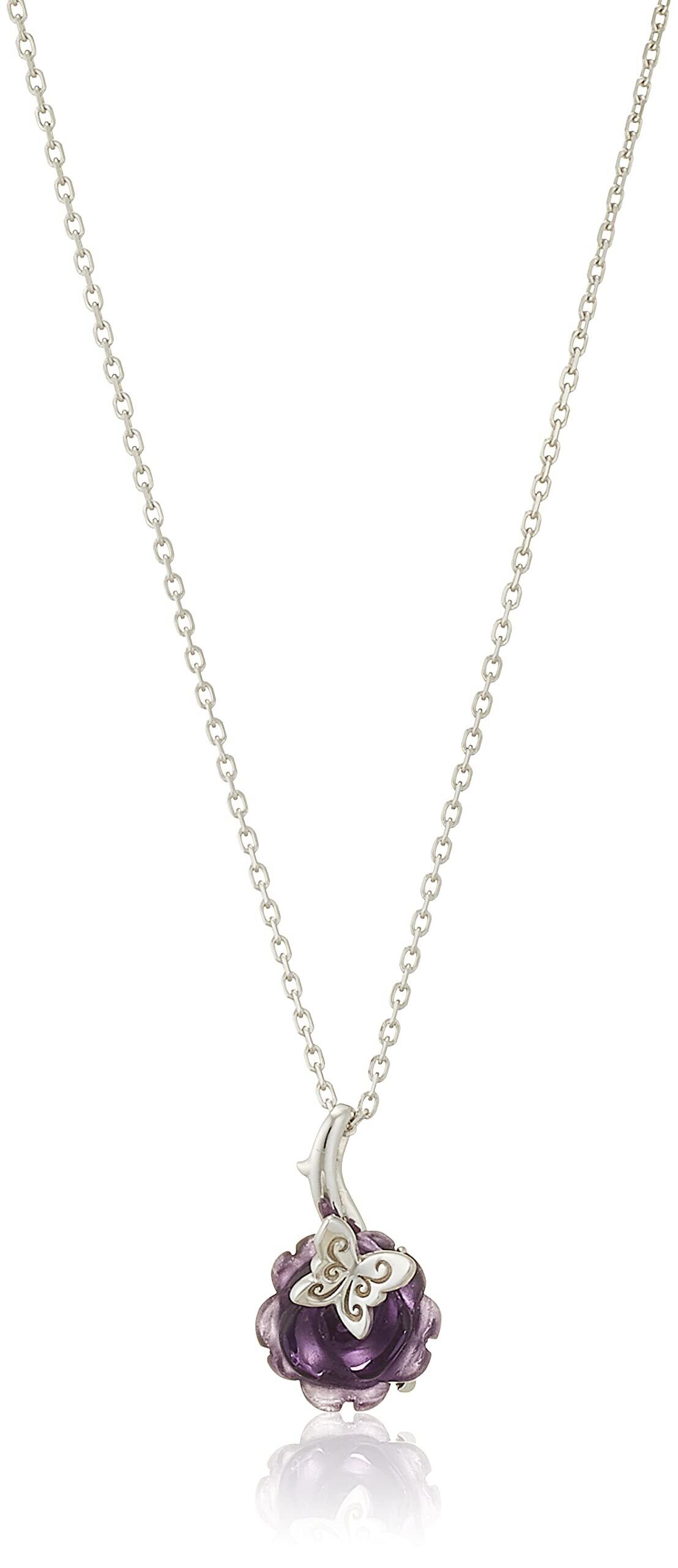 パープルの色味が美しいアメシストを薔薇のシェイプにカットした、ANNA SUIらしいネックレス。薔薇の茎、棘などディテールや、花に留まった蝶をシルバーで繊細に表現しています。日常使いしやすい上品なデザインはギフトにもぴったりです。※天然素材のため薔薇のシェイプとカラーには個体差がございます。