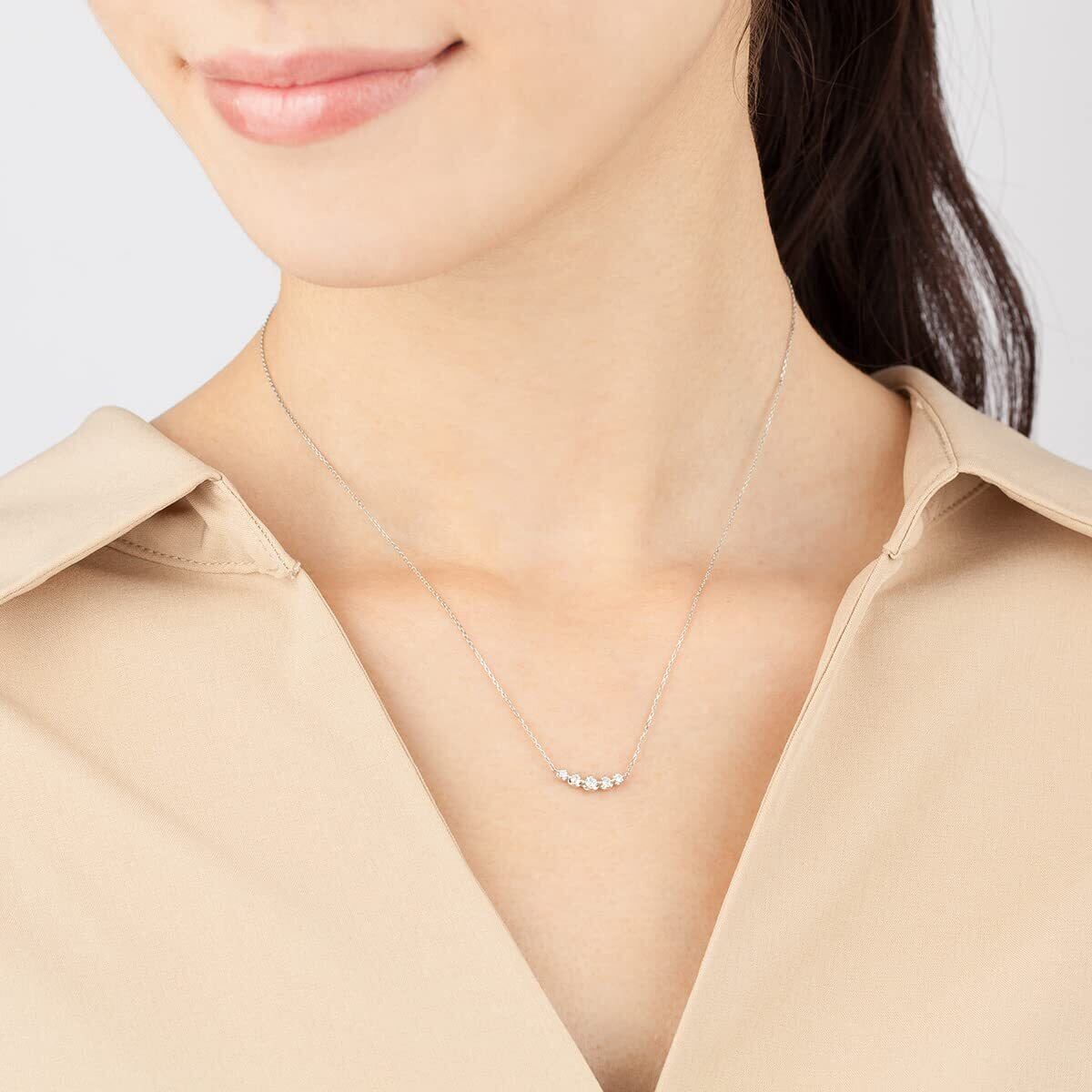 デコルテに沿って優しいカーブを描くダイヤモンドネックレス。ダイヤモンドとプラチナの上質な輝きが気品あふれる胸元に。洗練されたシンプルなデザインで、プレゼントにもおすすめです。