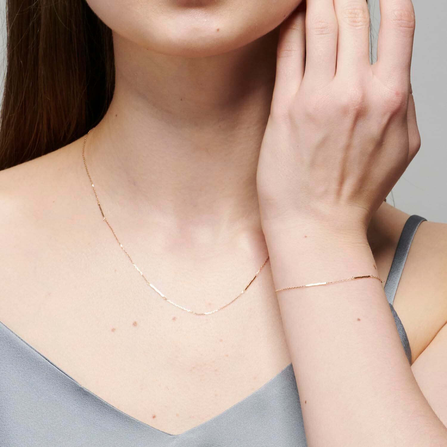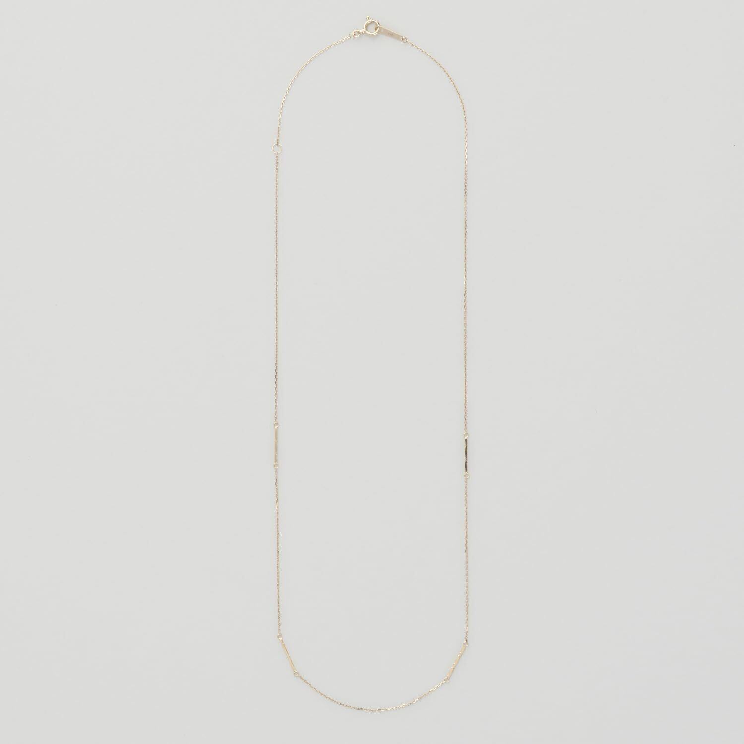 シンプルなチェーンに、地金のラインパーツを配置したステーションネックレス。潔く1本で着けるスタイルはもちろん、地金だけでまとめたレイヤードスタイルや、カラーストーンのチャームと組み合わせてじゃらっと重ね着けるスタイルなど。様々なコーディネートを楽しんで。※天然石・天然素材を使用しているものや、職人が1点1点加工しているものは、サイズ・色味・風合いの違いや、若干の傷、内包物の有無などに個体差があります。予めご了承ください。