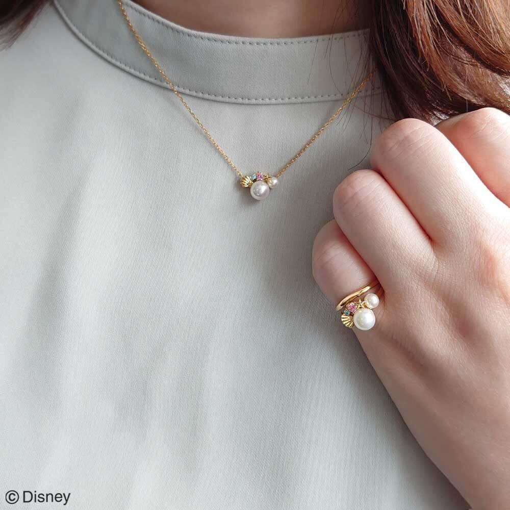 【リトルマーメイド】の世界観をそのままネックレスにしました。貝のモチーフや海の泡に見立てた淡水パールが華やかでにぎやかなネックレス。ブルーの石は海の煌めきを、ピンクの石はアリエルのドレスを表現。パールの輝きが上品さをプラスして、さりげなくデイリーに着けられるネックレスです。