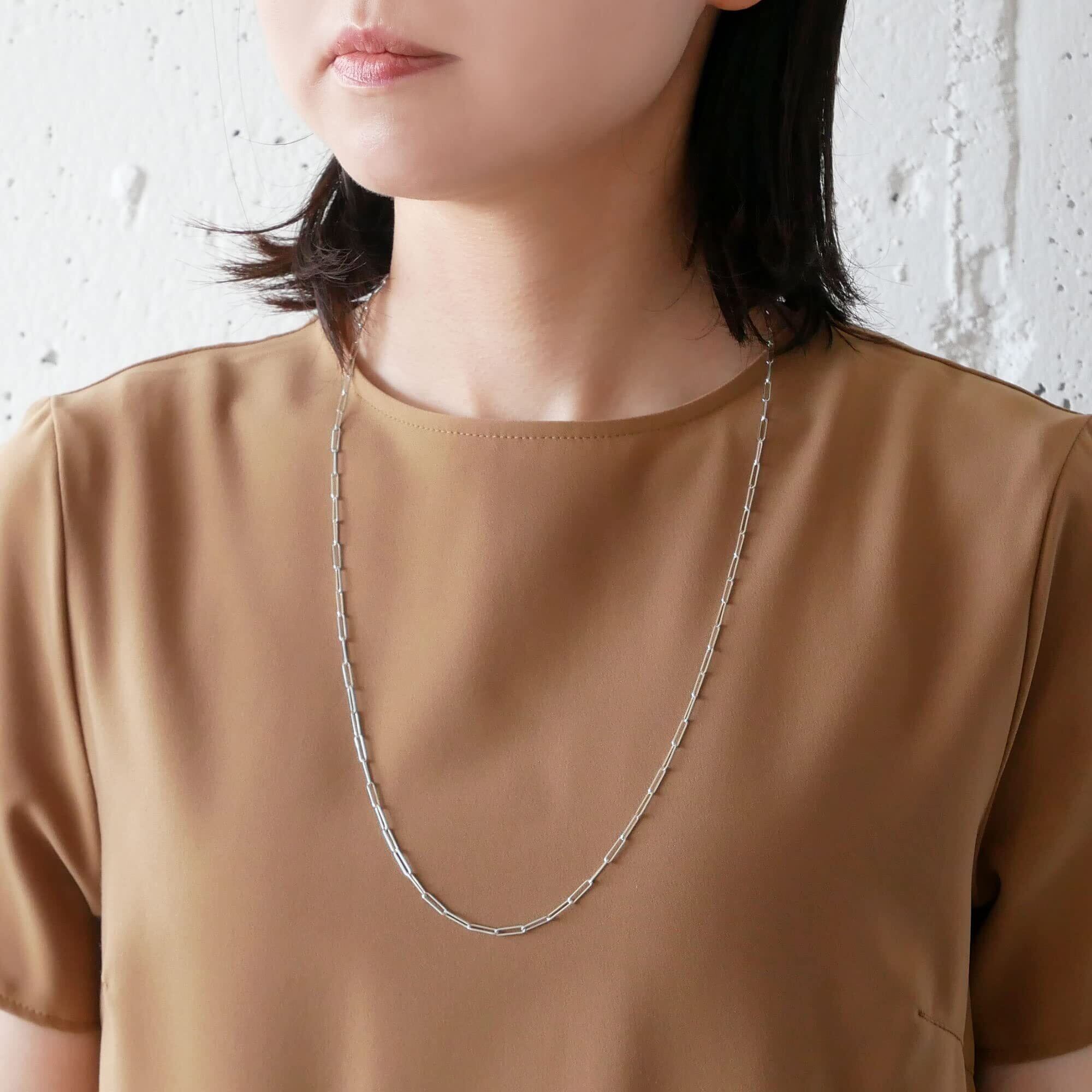 大きめの楕円が繋がったチェーンは軽やかでありながらシルバーの表情が見え、スタイリングのポイントに。