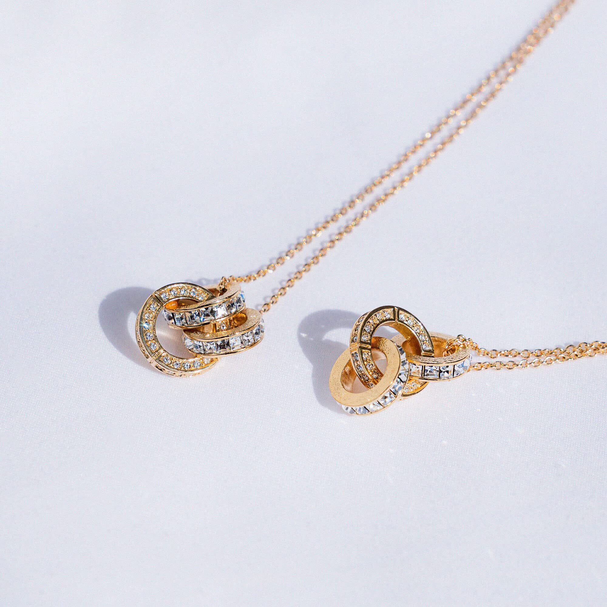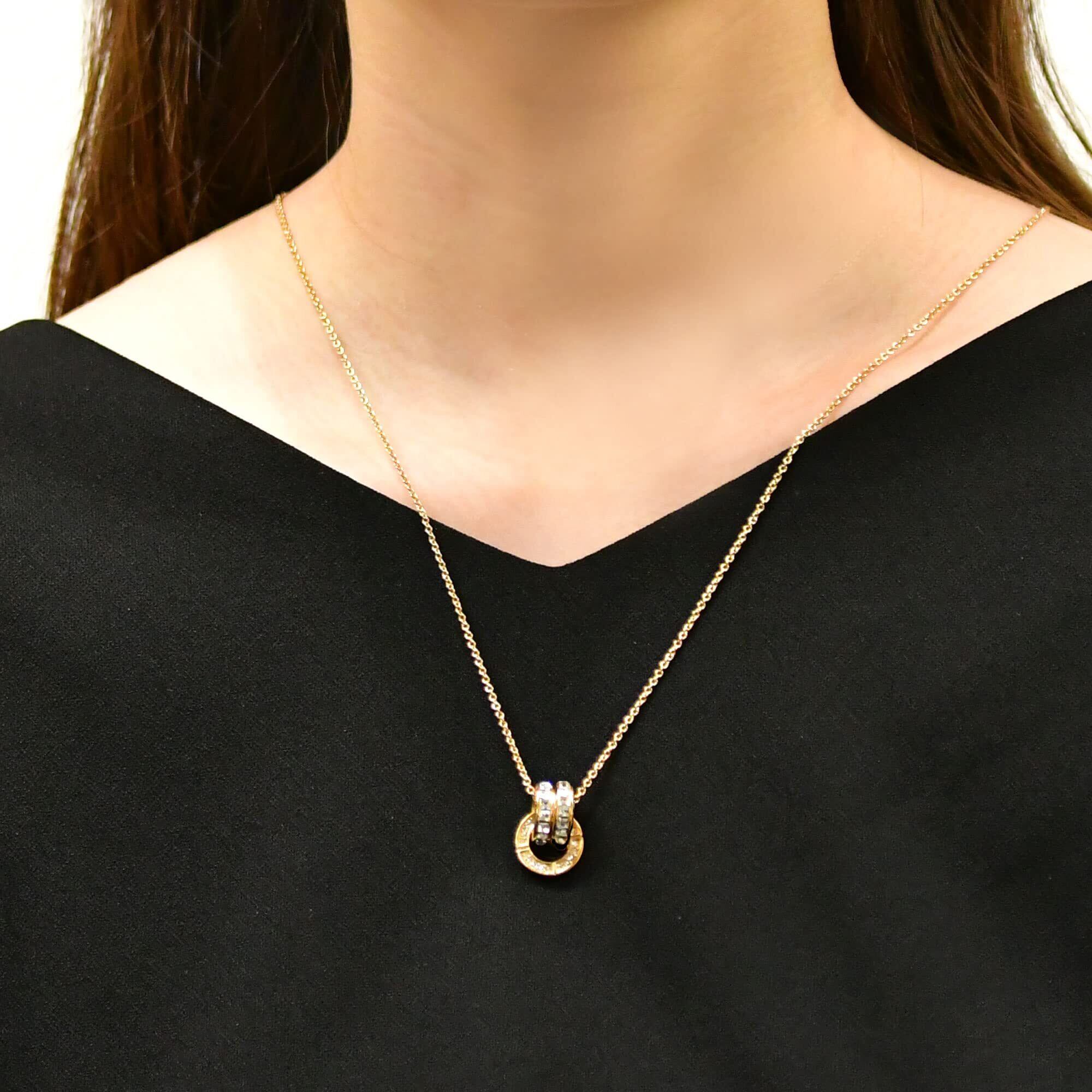 グロッセのベストセラー「バーティカル・ミス」。 3つのリングが縦につながった、無限大(∞)のデザインが人気。 リング部分には、クリスタルがびっしりと敷き詰められ、光の反射を受けキラキラきらめくデザインに。形も、縦・横また折りたたんだりとバリエーションが楽しめます。スライドアジャスターだから長さ調節も自在。 様々なアレンジが可能なマルチウェイ・ネックレスです。