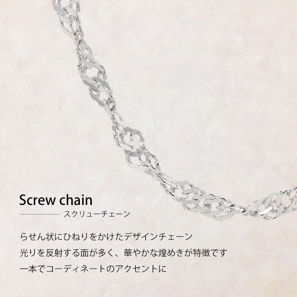 スクリューチェーンはチェーンネックレスにおける定番チェーンです。スクリューチェーンは連続した輪を捻ったパーツで形成されています。ネックレス本体だけでも充分存在感がある、エレガントなネックレスです。また、お持ちのペンダントトップにもお使いいただけます。東証スタンダードの宝飾品メーカー(株)ナガホリの定番チェーンネックレスです。当社の工場の名前に由来するブランド名「LA SOMA」が金具部分に刻印されています。この「LA SOMA」刻印が品質・品位の証です。