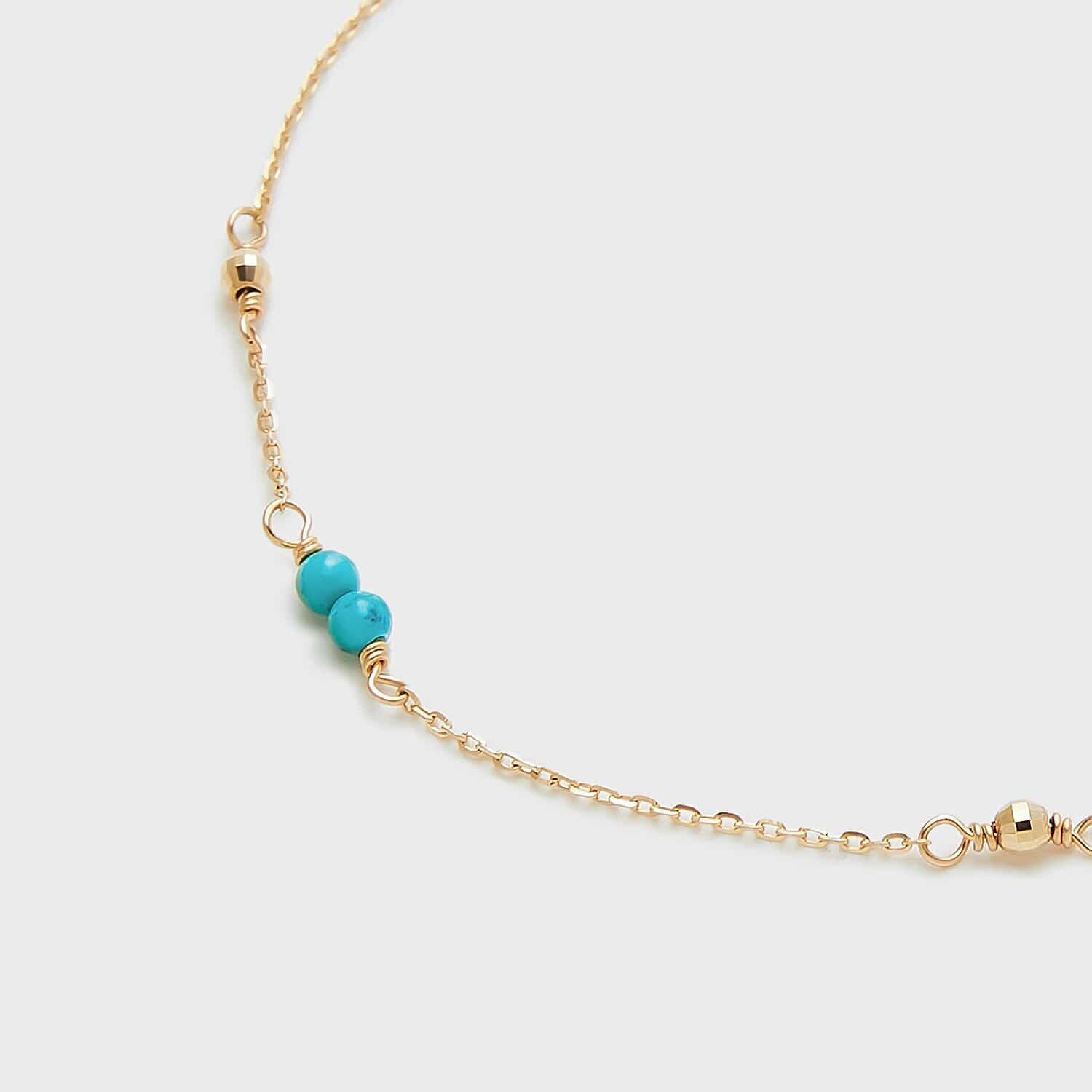 小粒なターコイズとミラーボールをランダムに配置したブレスレット。鮮やかな色合いのターコイズは小粒ながら存在感があり、手元が新鮮な印象に。リングとのハンドコーディネートを楽しんで。※シャンク線はゴールドフィルド、その他の部分はK10を使用しています。※天然石や天然素材を使用しているものは、サイズ・色味・風合いの違いや、若干の傷、内包物の有無などに個体差があります。予めご了承ください。▼オススメコーディネートはこちらの品番。30232116022、30232111059。
