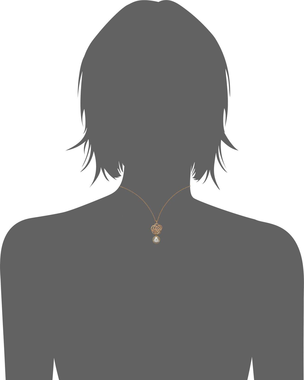 立体感のある薔薇の花が美しいネックレス。薔薇のモチーフには、職人がひとつひとつ小さなクリスタルをびっしりとセッティング。大きめのパールが揺れてエレガントな印象に。