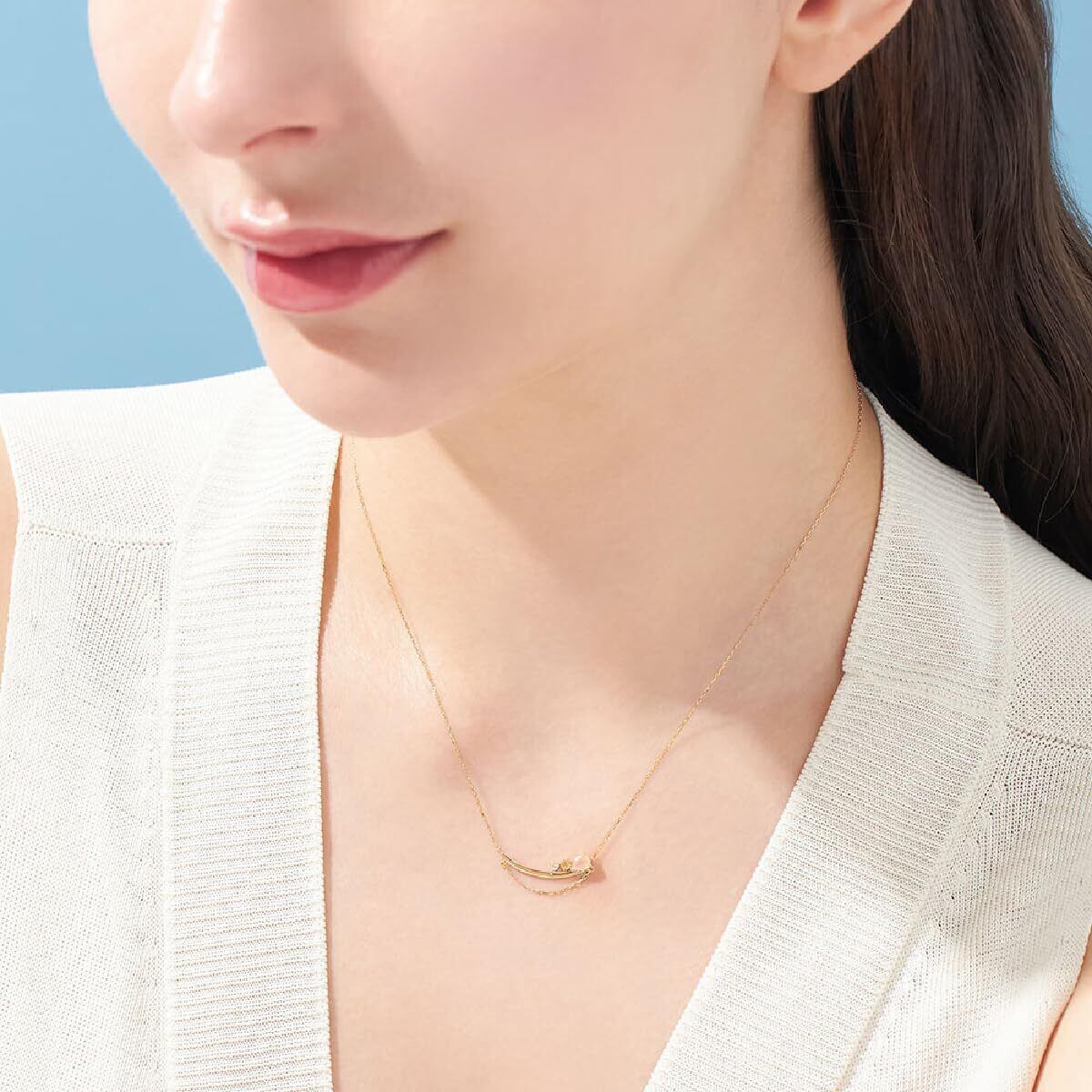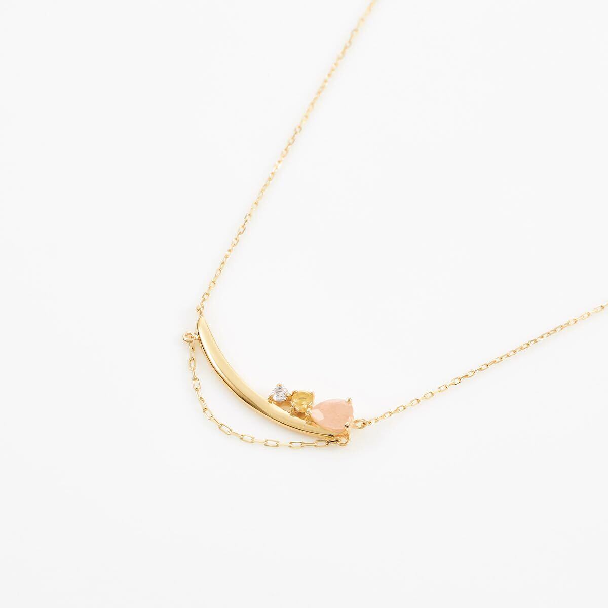 夏の夕焼け空にかかる虹をイメージしたK10ネックレス 。淡いオレンジ色のムーンストーンとシトリンが首元を彩ります。下に垂れ下がるチェーンも印象的で、夏のそよ風に揺られるように動きに合わせて軽やかに煌めきます。肌に溶け込む淡い色のデザインは日々のコーディネートに合わせやすく、ご自身のご褒美ギフトとしても大切なひとへのギフトとしてもおすすめです。