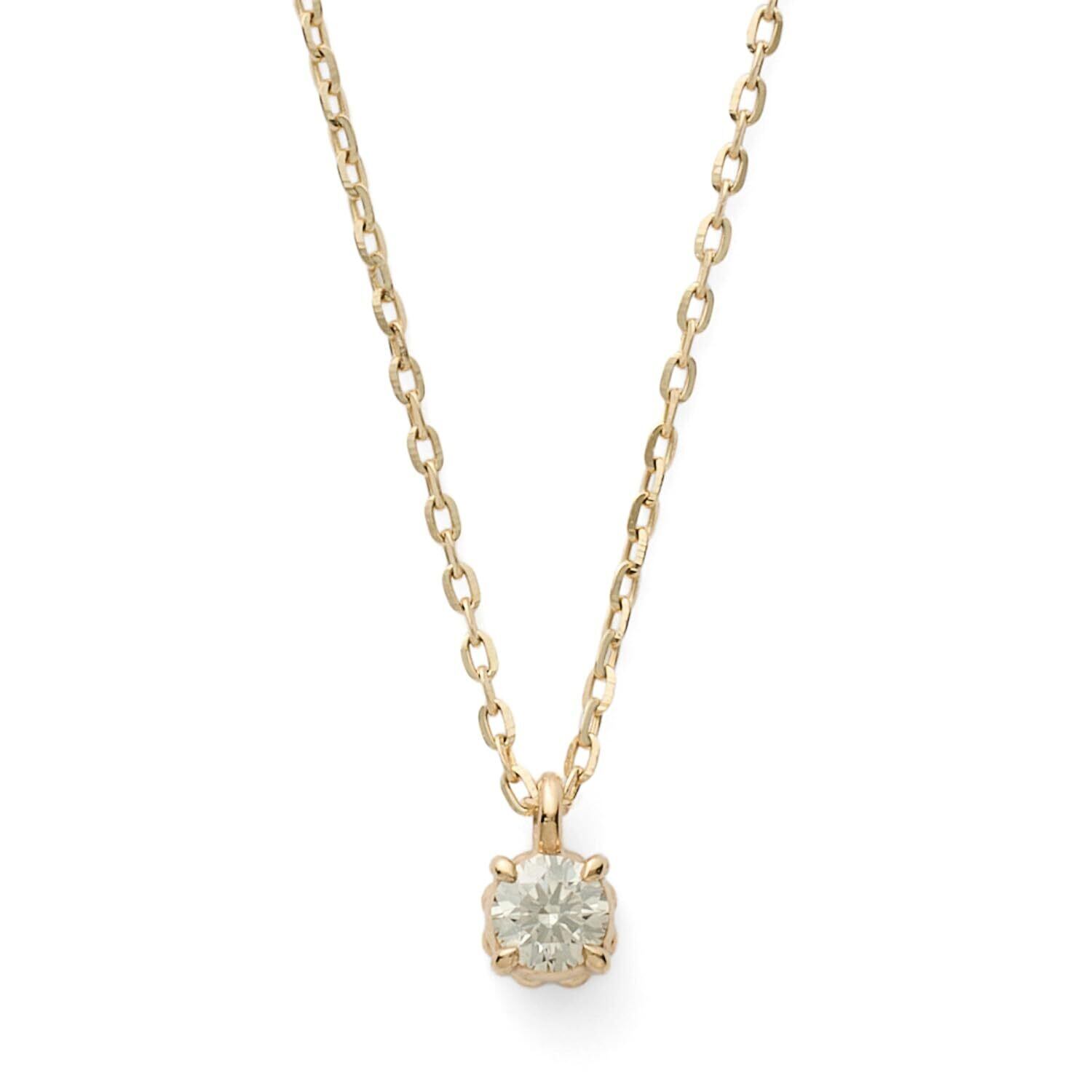 繊細な輝きを放つ、一粒メレダイヤモンドのネックレス。正面は4点の爪ですっきりと、サイドは高さを出してクラシカルな印象に。レイヤードを楽しまれたい方にもおすすめのベーシックアイテムです。※天然石や天然素材を使用しているものは、サイズ・色味・風合いの違いや、若干の傷、内包物の有無などに個体差があります。予めご了承ください。