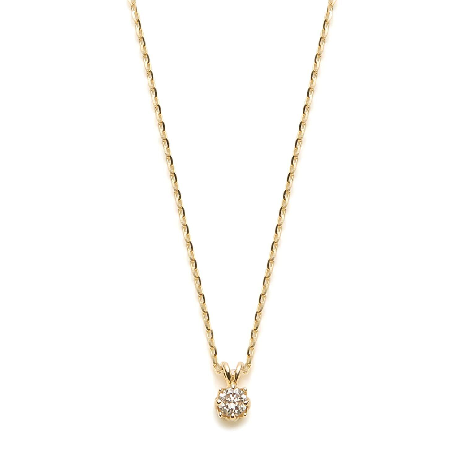 Always wear your invisible crown.「誰もがいつも目には見えないクラウンを頭に載せている。下を向いたら落ちてしまうから、あなたらしく前を向いて。」4本爪と飾り爪を足した8本の爪で細かくダイヤモンドを取り巻いたシンプルなデザインの中に、小さな物語を込めたひと粒ダイヤモンドネックレス。ダイヤモンドを優しく包み込む石座は、伝統的なロイヤルクラウンがモチーフ。正面からは見えない隠れデザインは、自分だけの秘密のお守りジュエリー。クラウンの透かし模様には「愛情」「幸福」の象徴とされるハートモチーフを忍ばせて、ダイヤモンドの宝石言葉「永遠の絆」とともに「小さな幸せが続きますように」という想いを込めています。どこから見ても美しい繊細な細工が魅力のネックレスです。ダイヤモンドのサイズは、0.05ctから0.15ctまでの3サイズ。素材はK18とK10からお選びいただけます。 ※天然石や天然素材を使用しているものは、サイズ・色味・風合いの違いや、若干の傷、内包物の有無などに個体差があります。予めご了承ください。