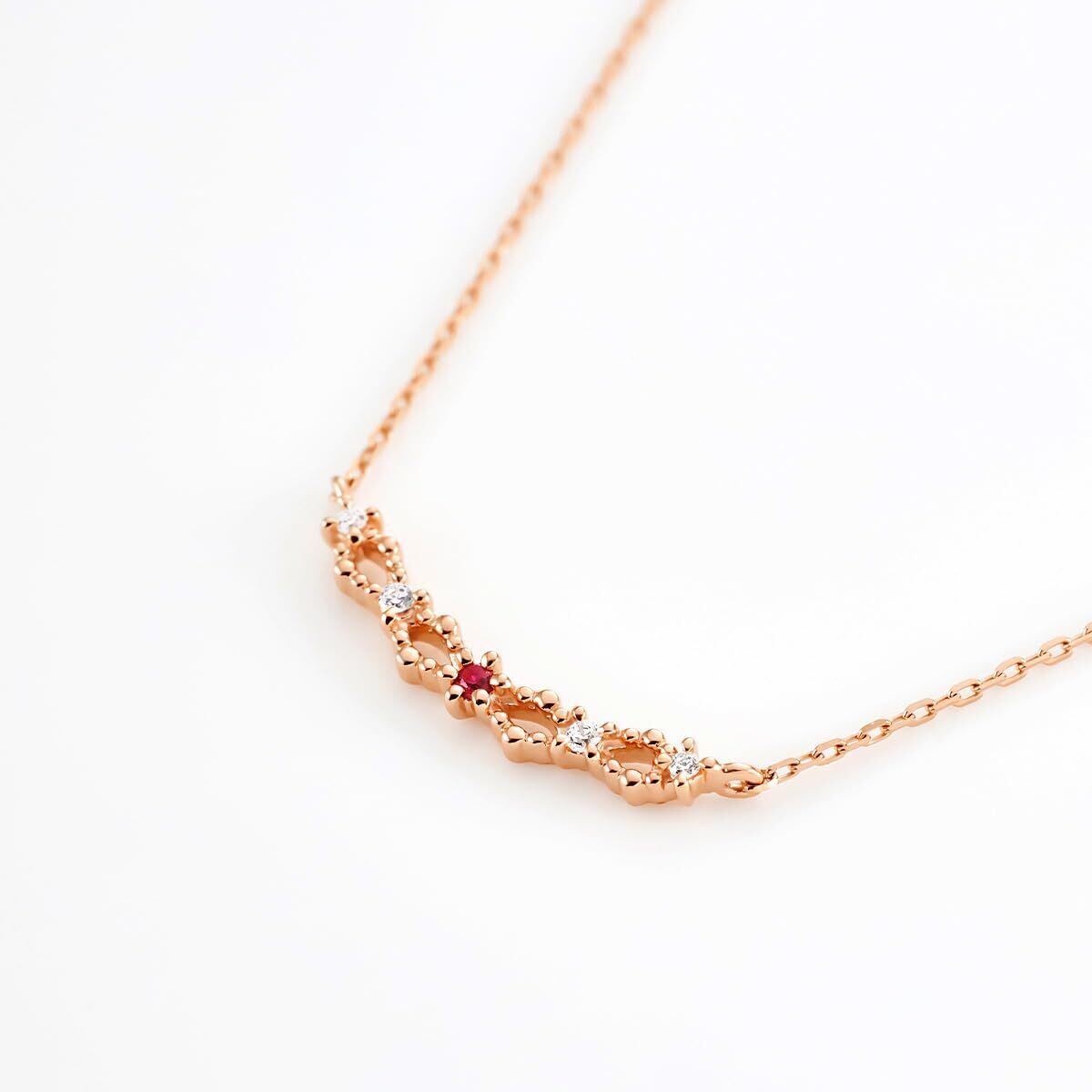 7月の誕生石、ルビーをセッティングしたラインモチーフのネックレス。