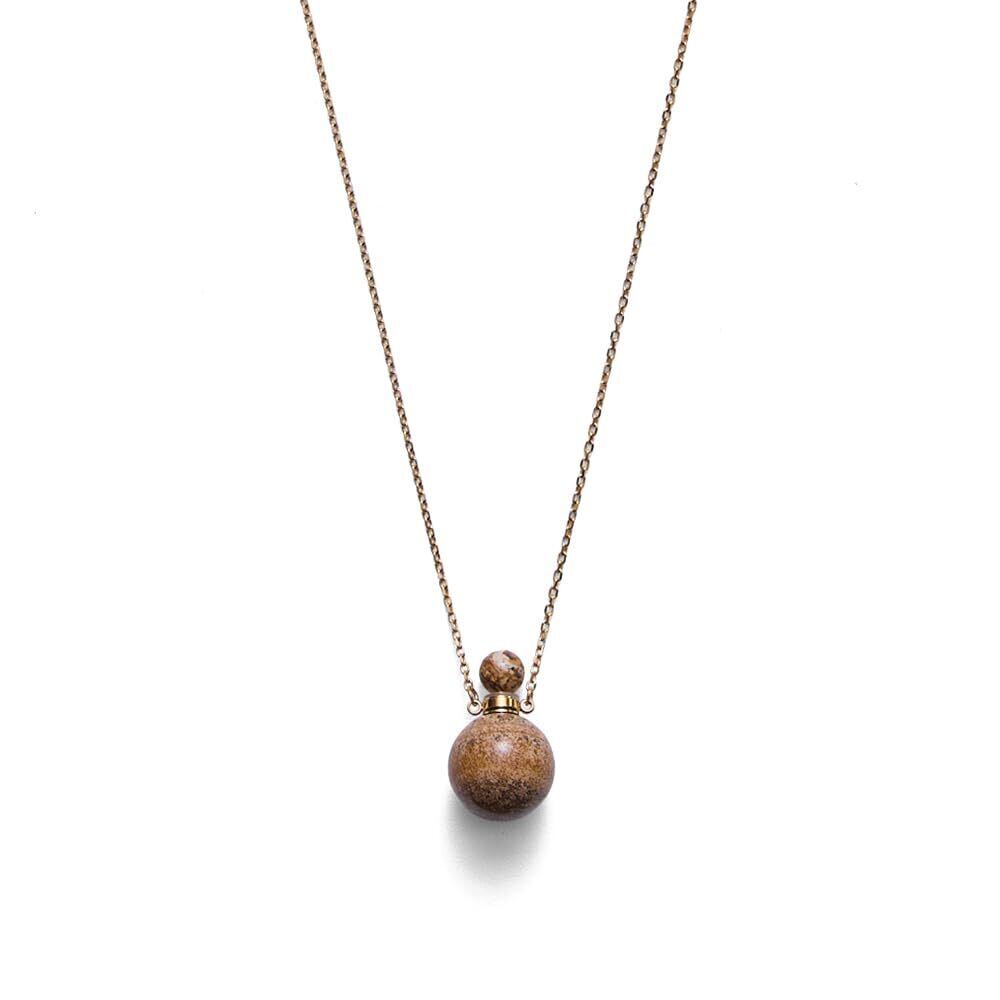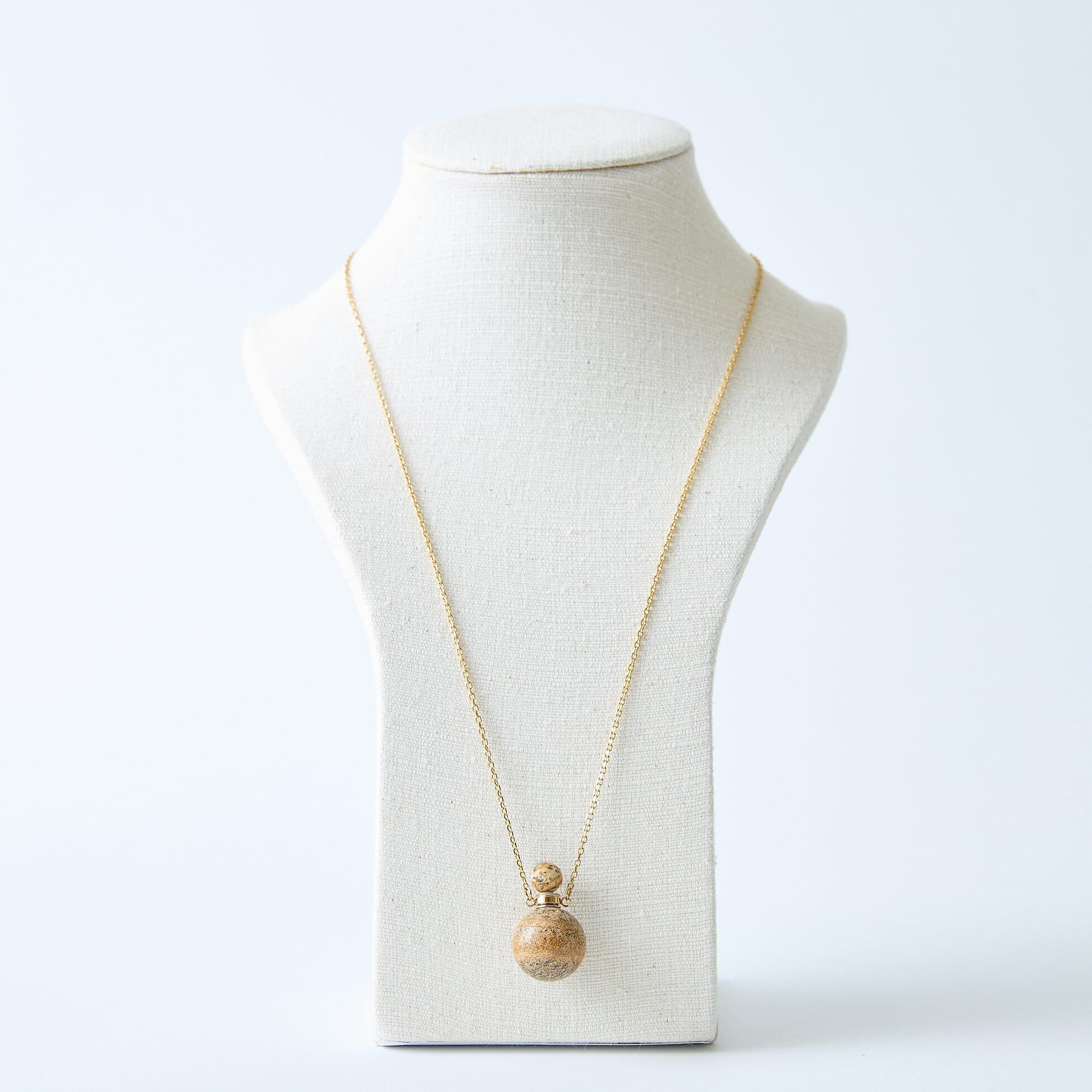 ボトル型の大きめな天然石が目を惹くネックレス。 天然石は上部の蓋を回して外すと中に香水やオイルを入れることができます。 いつでもお気に入りの匂いを持ち歩きたいという方におすすめ。(※スポイトは付属しません)