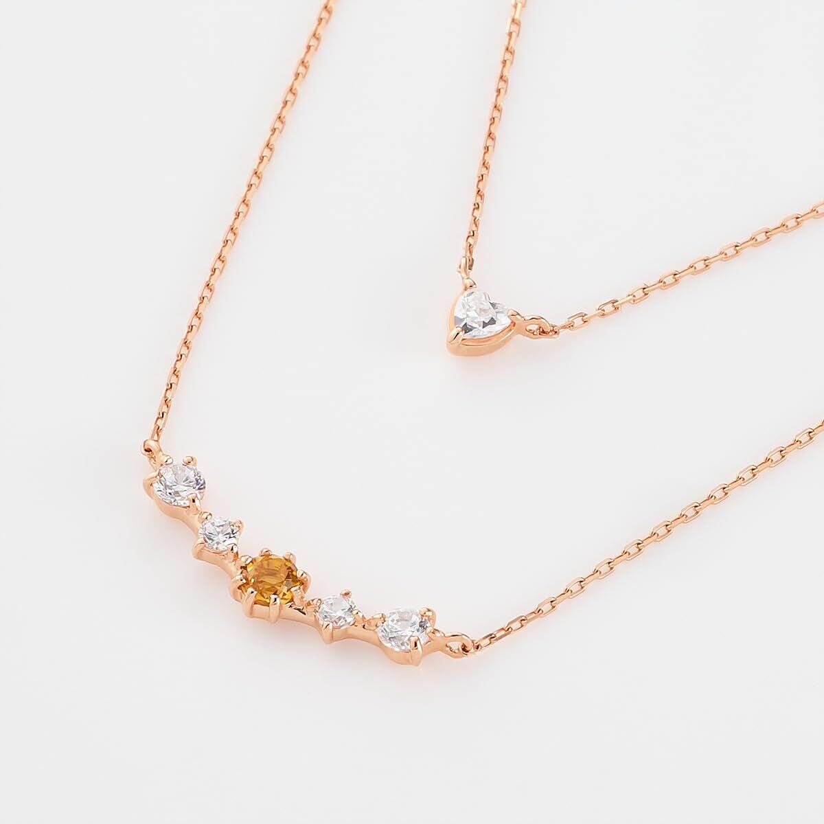 シンプルなハートの一粒ネックレスとセンターにシトリンが輝く横並びデザインが、コーディネートを華やかな印象に。