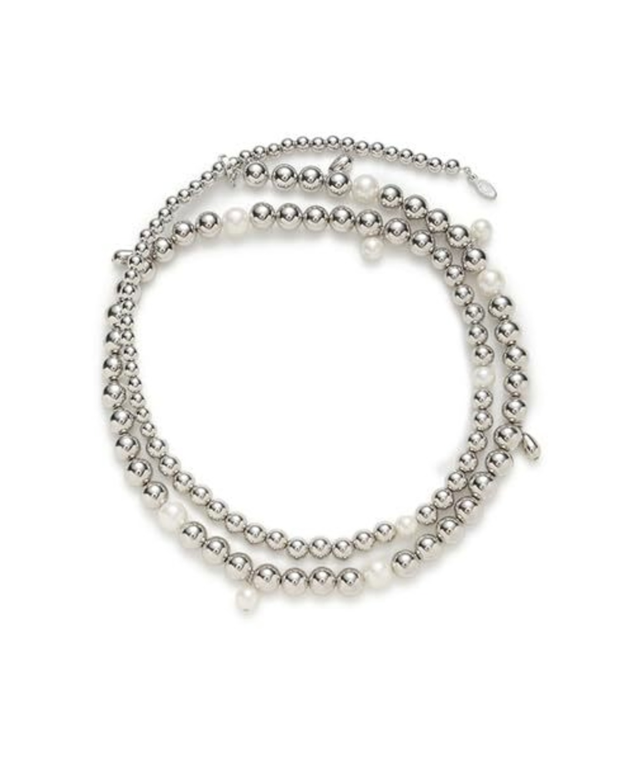 丸やツユ型のパール・メタリックパーツを散りばめたネックレス。ネックレスを2重にしチョーカーの様に短くして付けたり、1重にしてロングネックレスとして付けたりと、様々な見え感で取り付けることのできる仕様にしています。スタイリングに合わせて雰囲気を変えてお使いいただけます。