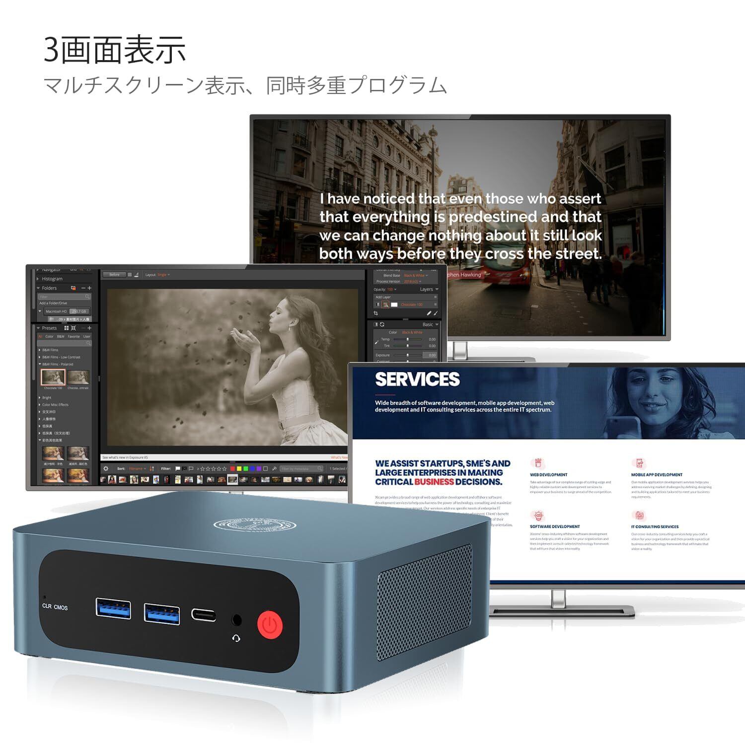 【マルチインターフェースデザイン】S5 Pro 5850UミニPCは、HDMI+DP、3つのUSB3.2 Gen2ポート、1つのUSB2.0ポート、1つのType-C(ビデオ&データ)ポート、1つのDCジャック、1つのRJ45 1000mポート、1つの3.5mmオーディオジャック(HP&MIC)ポートを装備しています。Gigabit Ethernet RJ45 1000Mネットワーク接続をサポートしています。小型PCは、ゲームや仮想化作業にも使用できます。