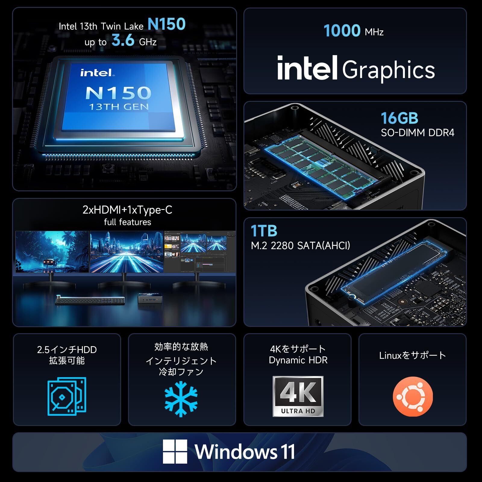 N150初登場ミニpc BMAX B4 Turbo 13thインテル Twin Lake-N150 16GB DDR4 2666MHz 1TB SSD mini pc Win11 Pro/Linux 4コア/4スレッド 最大周波数3.6GHz WIFI5/BT5.0 TDP 小型pc USB×4/HDMI 2.1 ×2/Type-C×1 TDP 6W 静音性 高速 3画面同時出力
