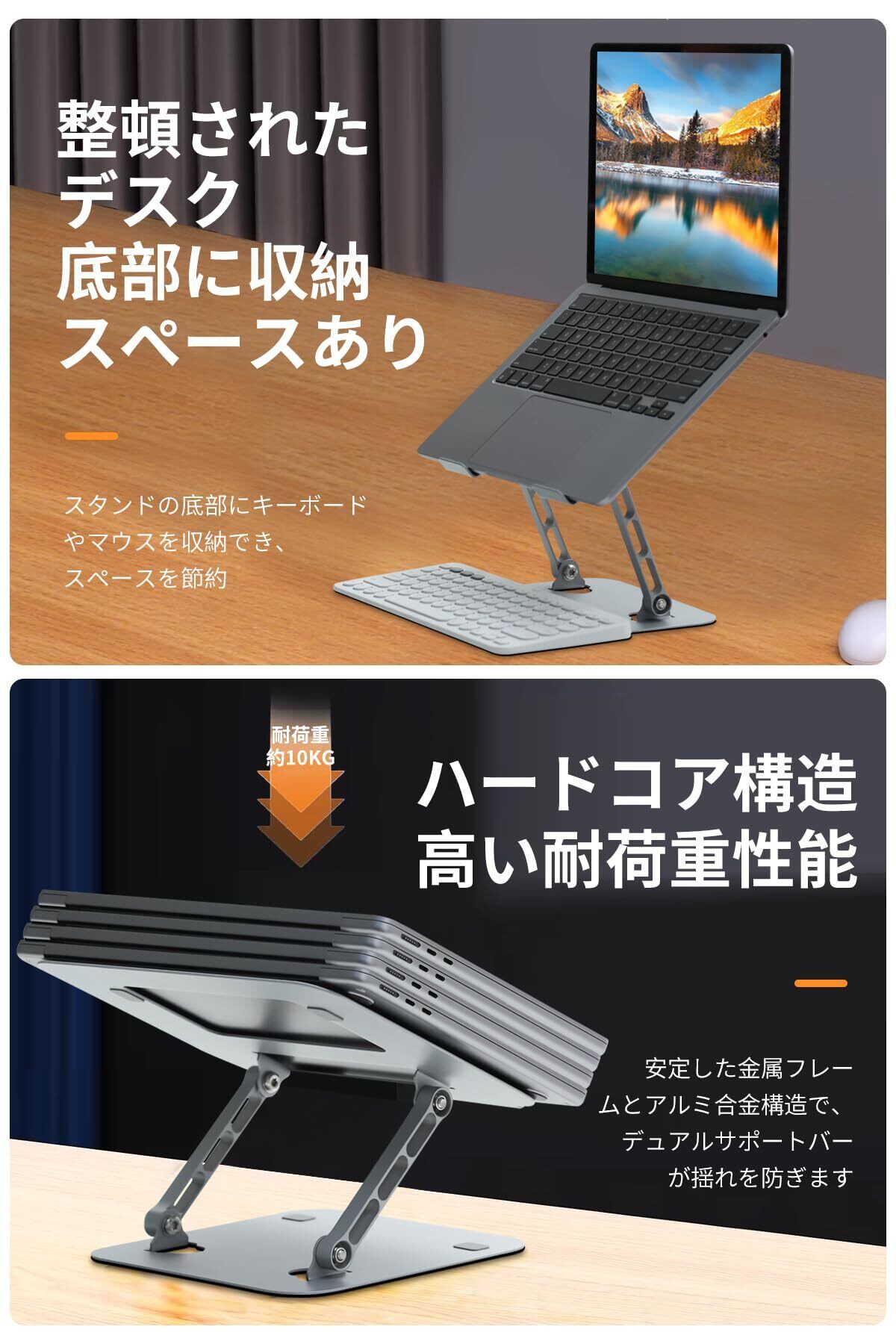 【整然とした空間と持ち運びやすさ】私たちのこのシルバーのノートパソコンスタンドは、底部に便利な収納スペースを備えており、キーボードやマウスなどの小物を簡単に収納してデスクを整然と保つことができます。また、軽量設計のため、持ち運びが簡単で外出先での作業にも便利です。短期の出張や長期の旅行でも快適に持ち運びできます。折りたたみ可能な仕様で、省スペース収納も可能です。PC作業やタブレットの使用などに最適で、お好みに応じて適切な高さや角度を調整できます。在宅勤務にも最適で、快適に作業を進められます。スタイリッシュで多機能なノートパソコンスタンドは、さまざまなシーンで便利に使用できるアイテムです。