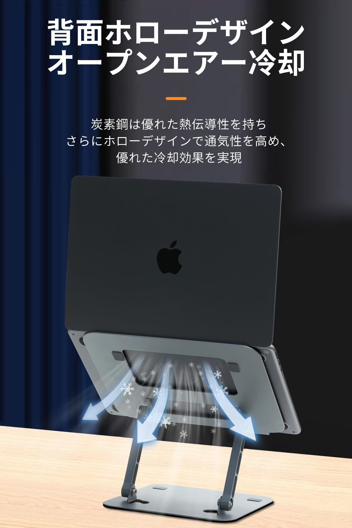 【優れた放熱性能】スタンドの背面には革新的な通気設計が採用されており、カーボンスチールの優れた放熱性能と相まって、空気の流れが確保されます。ノートパソコンスタンドのオープンデザインにより、長時間の使用でもデバイスの温度を適正に保つことができ、パフォーマンス低下や寿命の短縮を防ぎます。仕事、ゲーム、デザインなどのシーンでの使用に適しており、ノートパソコンスタンドの放熱機能が快適で安定した操作環境を提供します。
