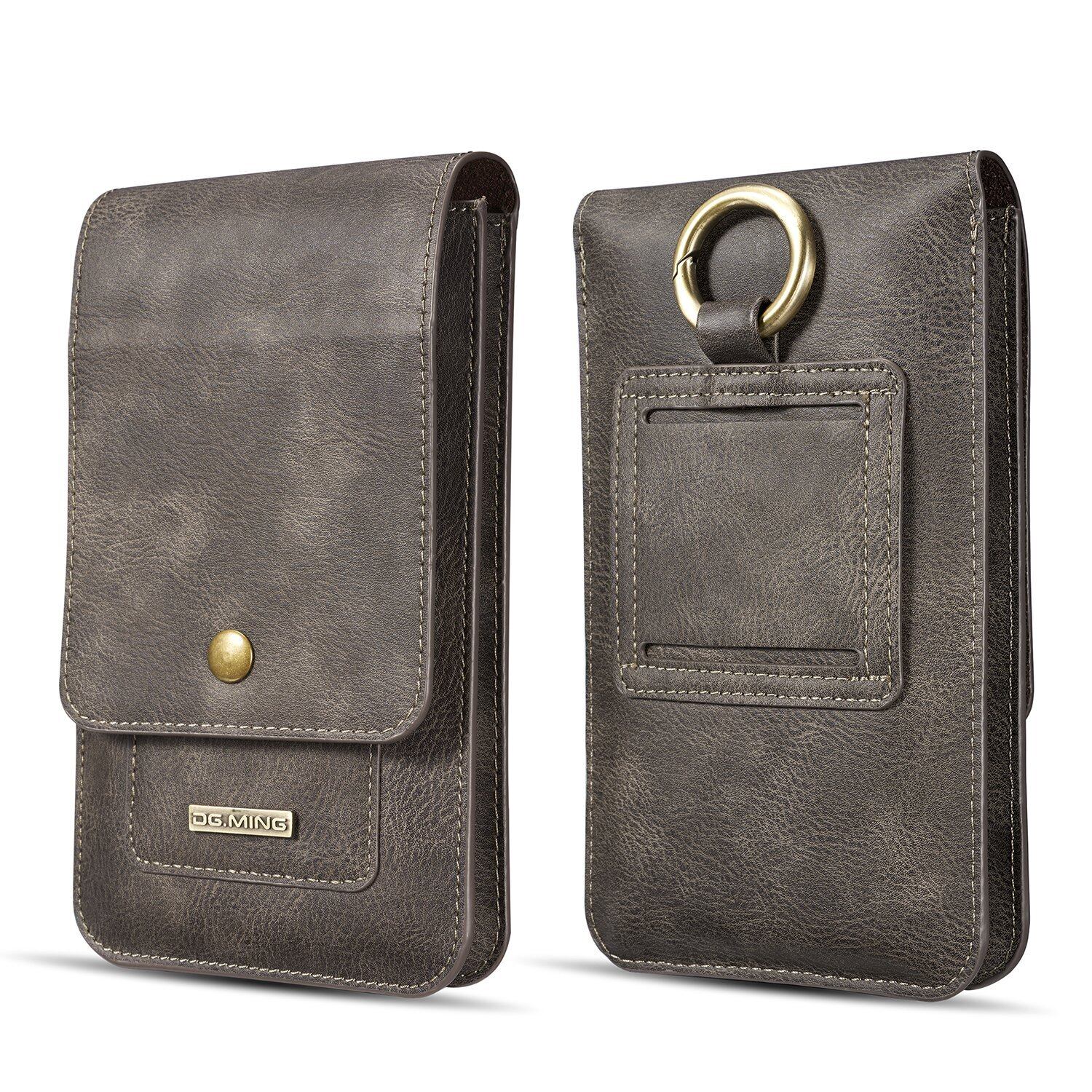 スマホポーチ カラビナ付き ベルト装着 11層カードホルダー スマホ2台収納 本革 スナップボタン式 ウエストバックiPhone SE/6/6s/7/8 など5.2インチ以下の機種対応 縦型(グレー)