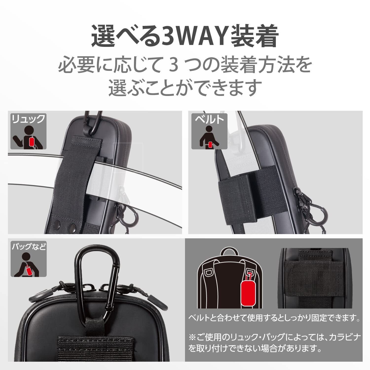 スナップボタンでしっかりとまるベルトループ、面ファスナーで固定できるショルダーベルトループ、取り外し可能なカラビナフックを装備し、お好きな装着方法を選ぶことができます。