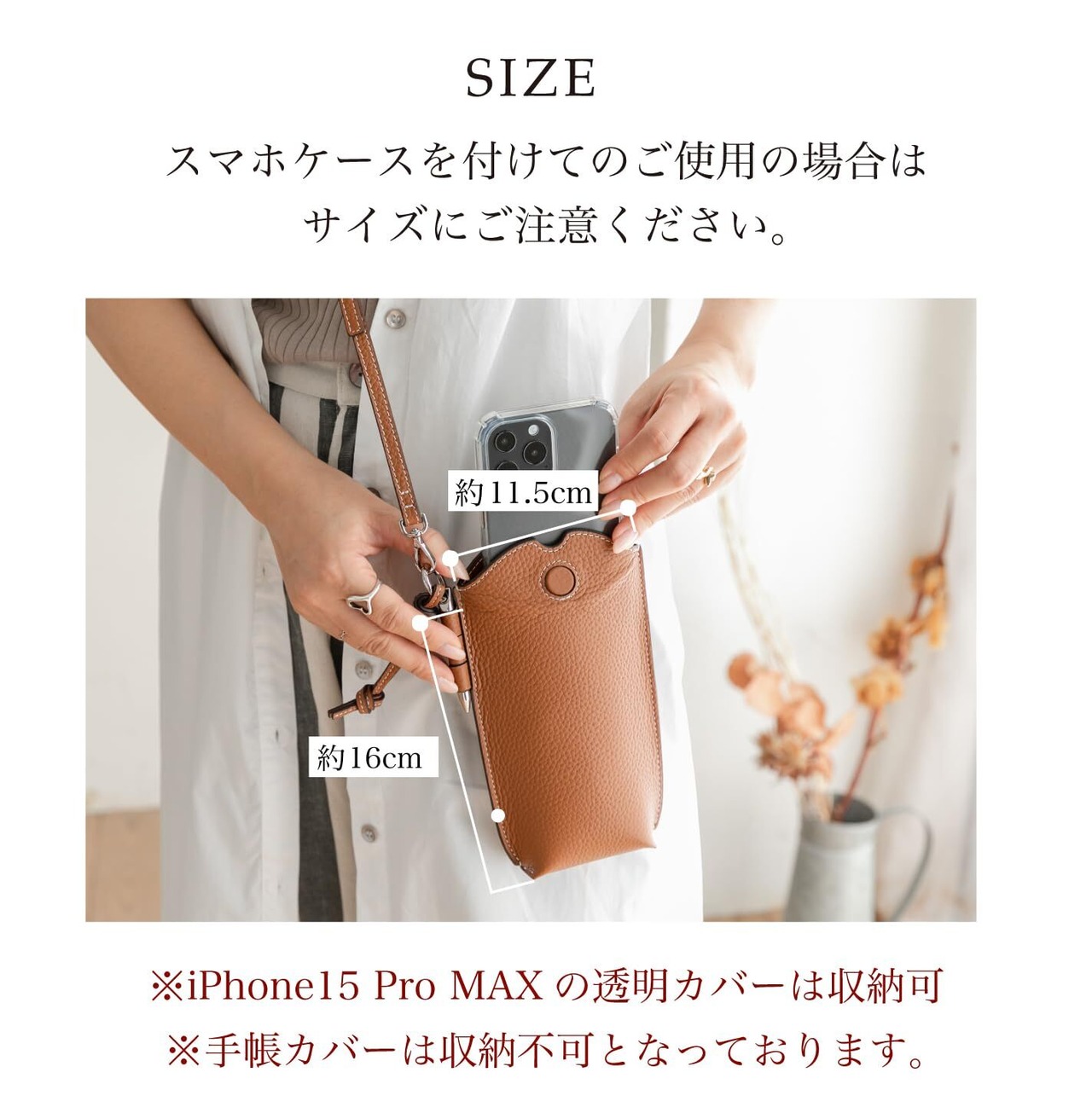 外寸:縦 約18.5cm×横 約11.5cm(開口部)、約8cm(下部)×マチ 約4cm※iPhone13Pro Maxのサイズまで収納可能。※スマホケースやカバーによっては入らない場合もございます。