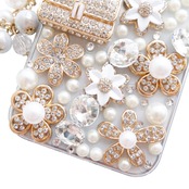 かわいいカバー 女性ストーンケース:金属ハンドバッグ、カメリア花デザインに合わせた珍しい丸い玉の流苏ペンダント,大量のストーンと真珠で表面を覆っていて,あなたのかわいい携帯ケースを輝かせます。