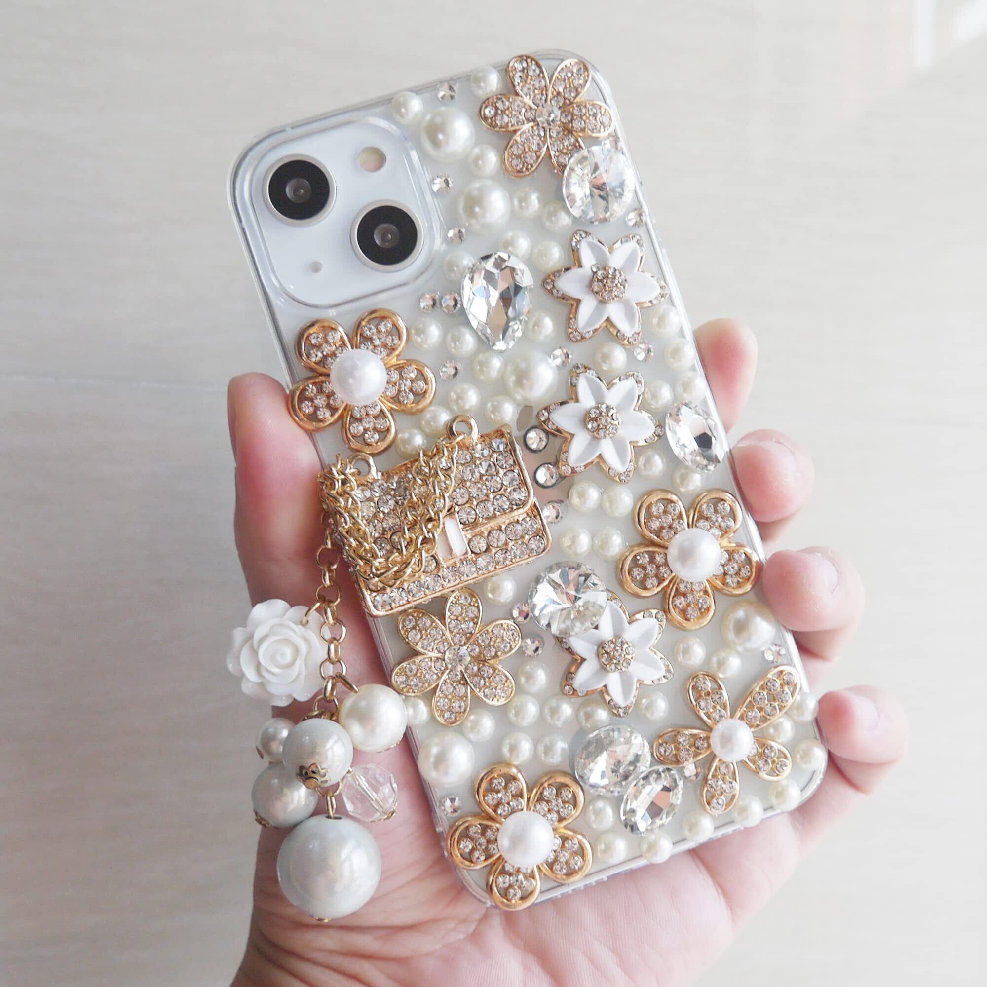 かわいいカバー 女性ストーンケース:金属ハンドバッグ、カメリア花デザインに合わせた珍しい丸い玉の流苏ペンダント,大量のストーンと真珠で表面を覆っていて,あなたのかわいい携帯ケースを輝かせます。
