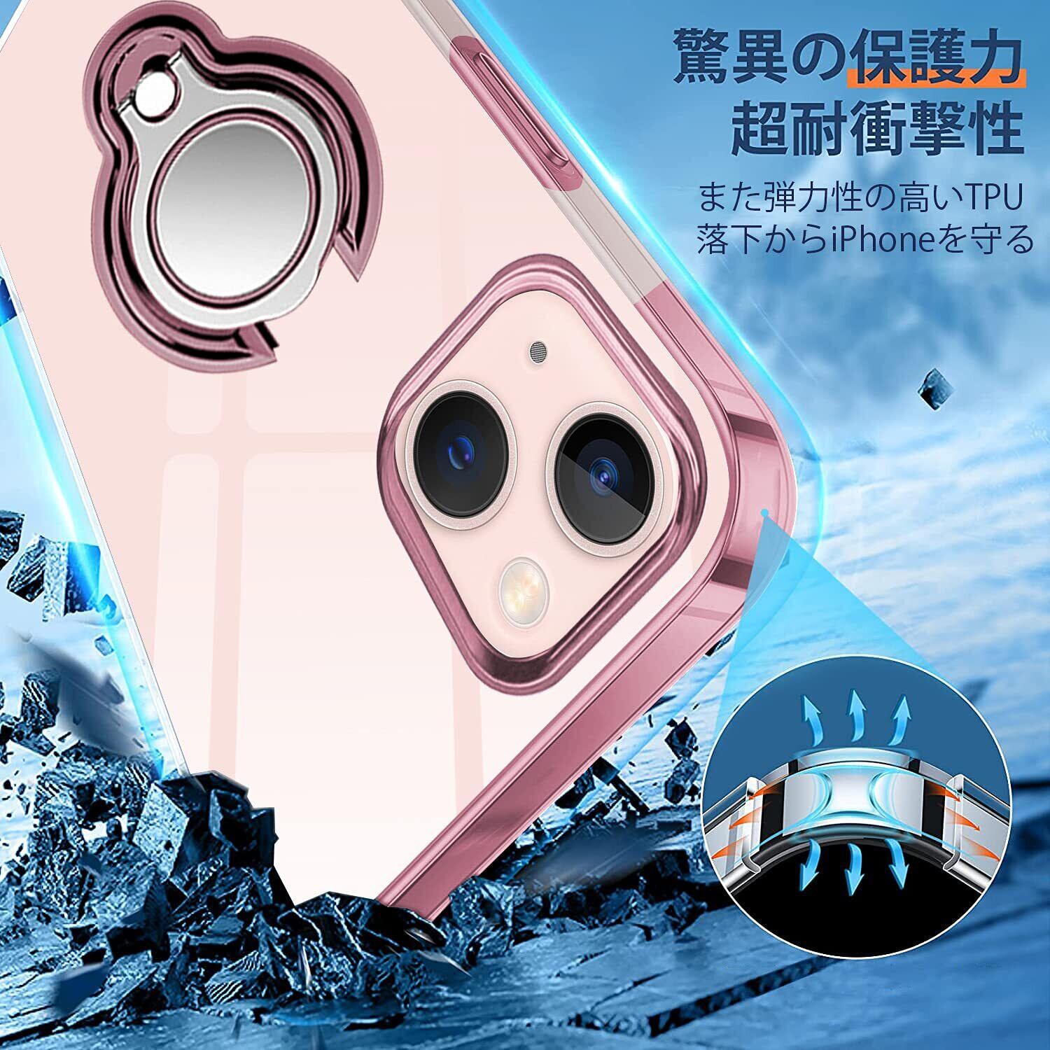 iPhone 13 用 ケース リング付き クリア 透明 TPU 耐衝撃 軽量 薄型 擦り傷防止 アイフォン 13用 スマホケース スタンド機能 車載ホルダー対応 ストラップホール付き カバー6.1インチ(ローズゴールド)
