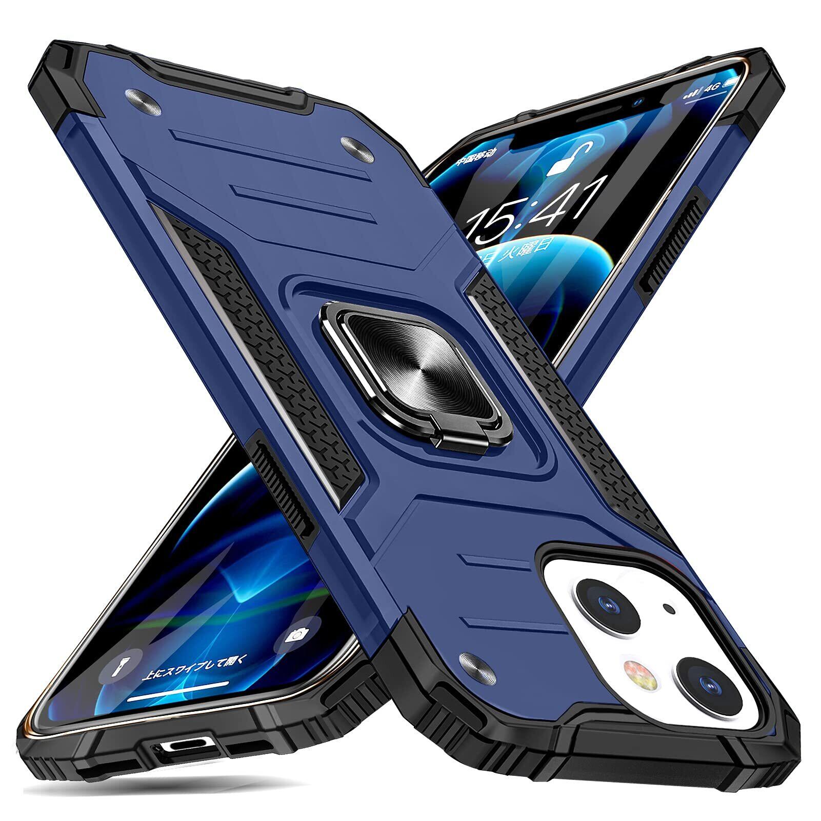 iPhone 13 用 ケース リング 衝撃吸収 耐衝撃 落下防止 米国軍事MIL標準取得 スタンド機能 PC+TPU 二重構造 防塵 薄型 軽量 一体型 360度回転 全面保護カバー アイフォン 13 用 ケース 青 MJJ-SJ-1051-24-03