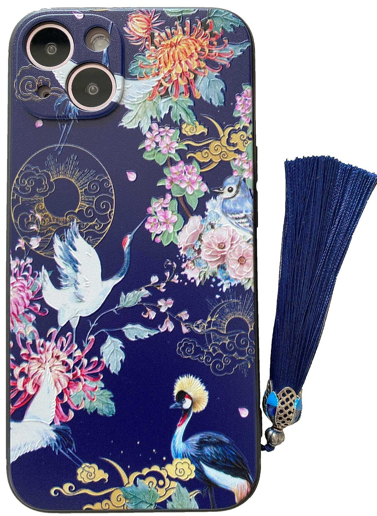 KOLO【鶴 花】 iPhone13 ケース iPhoneケース iPhone13ケース 菊 中国風のスマホケース スマホカバー(紺 iPhone 13