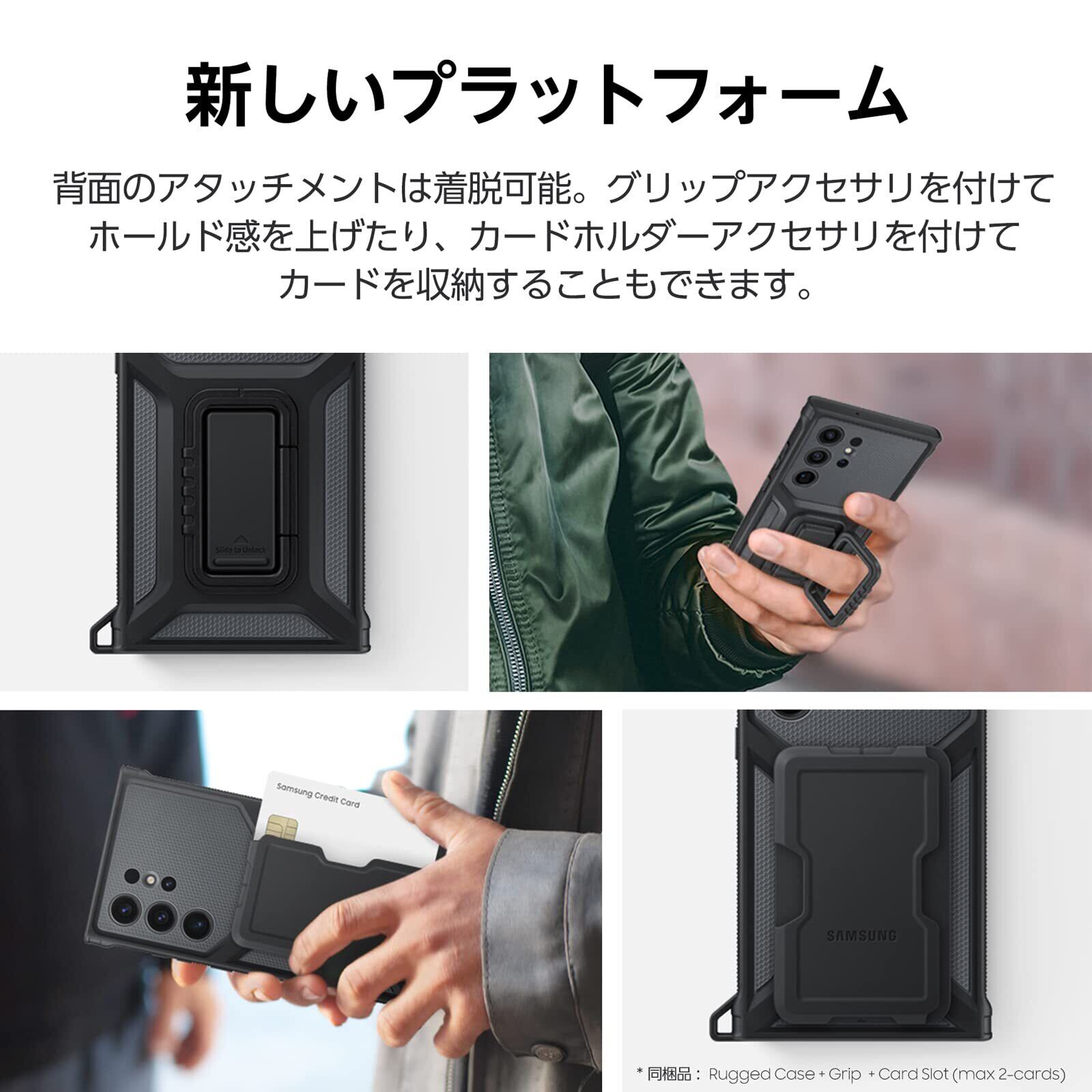 背面のアタッチメントを付け替えて自分好みのカスタマイズ可能。MIL規格に適合しているため過酷な環境でも端末をしっかり保護します。同梱のカードスロットやスタンドグリップで状況に合わせたカスタマイズをお楽しみください。