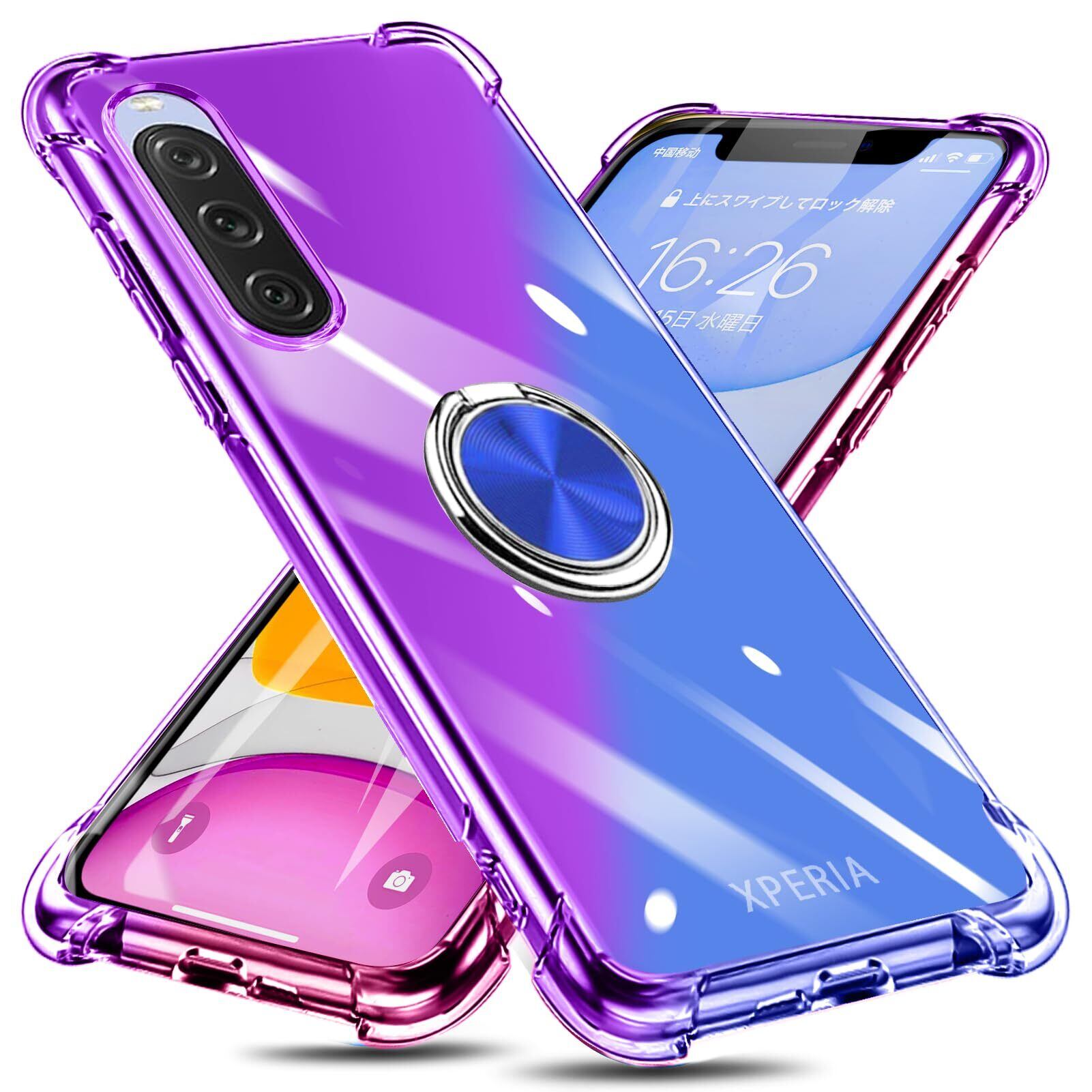 Xperia 10 V ケース リング付き クリア TPU グラデーション色 SO-52D SOG11 ケース 携帯カバー 耐衝撃 透明 車載ホルダー対応 一体型 落下防止 防塵 変形防止 全面保護 エクスペリア 10 V カバー 紫/ブルー W-CSZH-37-03