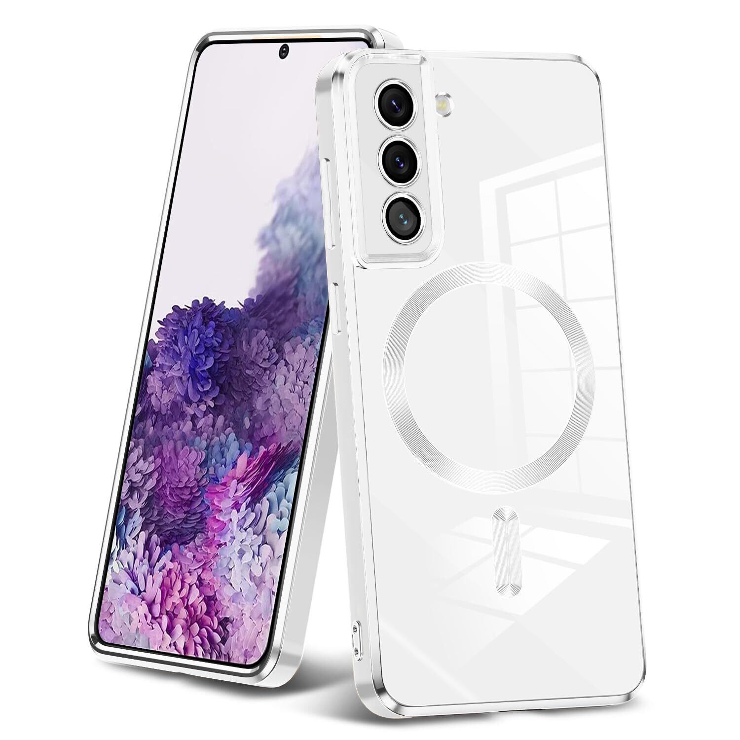 Galaxy S21 用ケース マグネット搭載 耐衝撃 TPU ケース レンズ保護 メッキ加工 磁気スマホケース ソフト ワイヤレス充電 ストラップホール付き 黄変なし 薄型 軽量 ギャラクシーS21 用カバー メッキ枠 人気 おしゃれ ホワイト JP6-5