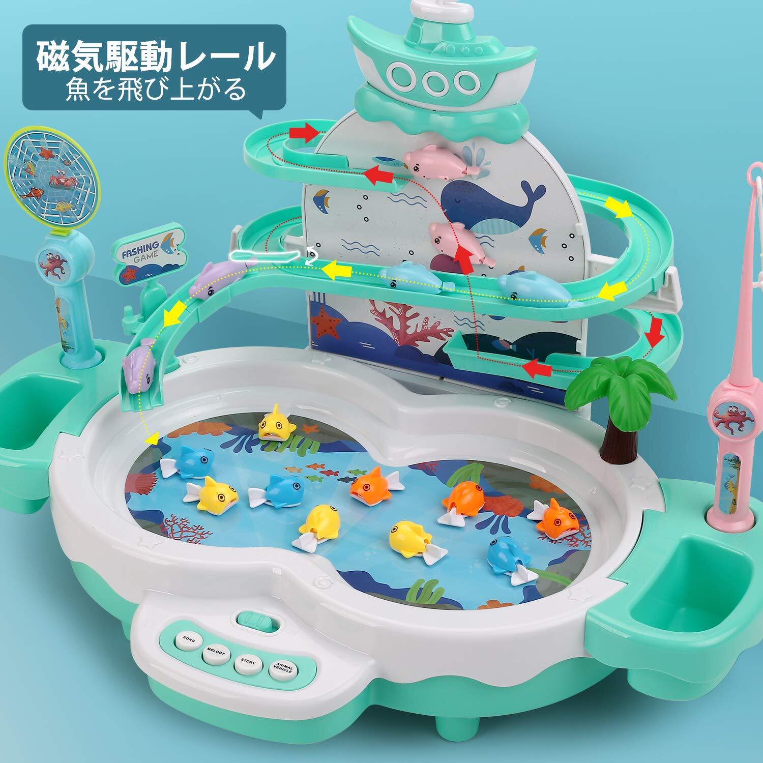 【磁気駆動式】魔法のような可変スライドを備えたフィッシングゲームトイ。磁気駆動により、魚はお水なしでも、泳ぐこと&下のレールから上のレールへ「飛ぶ」ことができ、音楽とともに回転することもできます。魚釣りごっこを楽しめましょう!