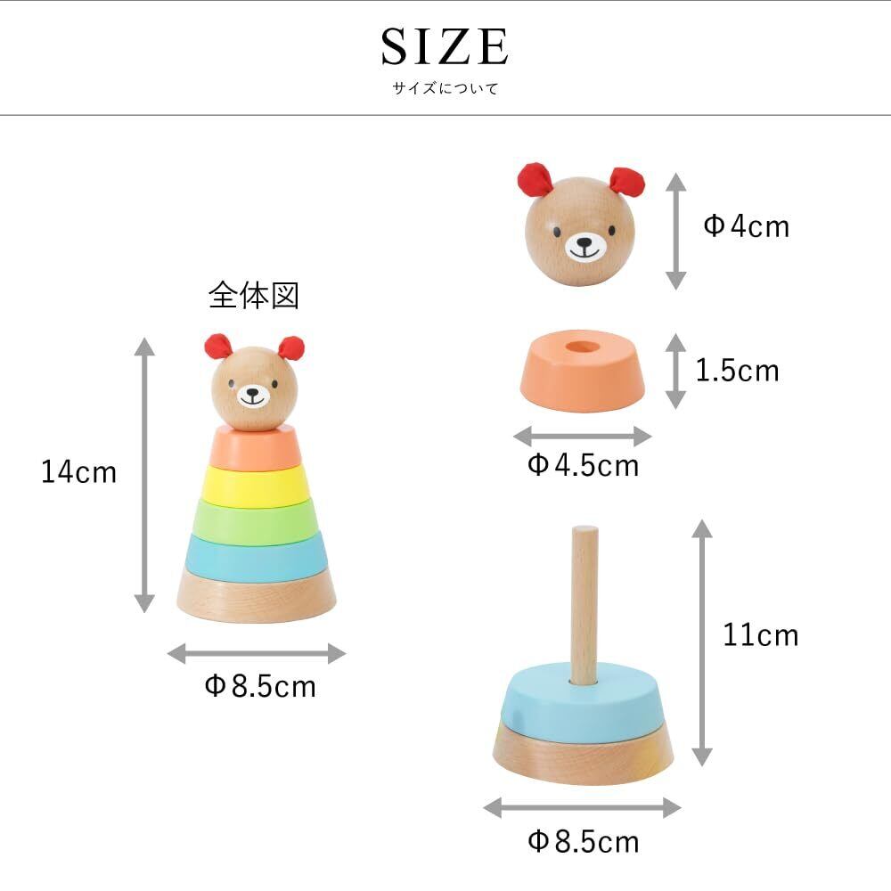 【対象年齢】1歳 12か月から 【商品内容】スタッキングトイ (リング型つみき) 【商品サイズ】直径8.5×14㎝ 【パッケージサイズ】約12×9×16㎝ 【安全・品質にこだわり】CE ヨーロッパ安全規格、おもちゃ安全基準「EN71」適合品。お子様がなめても安全な塗料を使用しています。